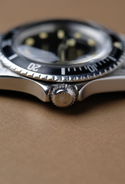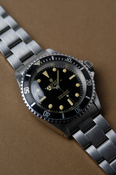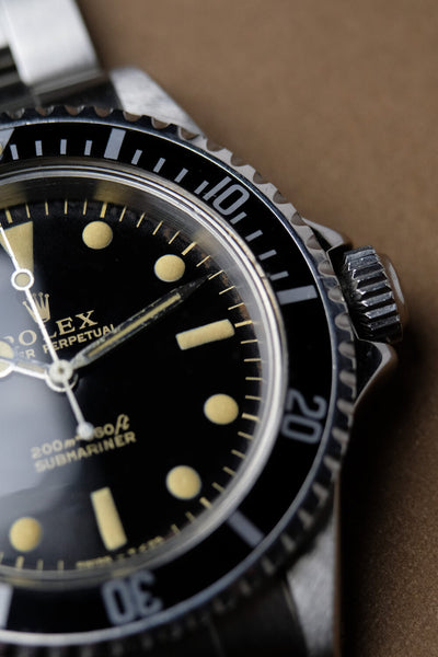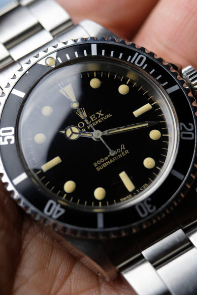 Description: 1964 Gilt 5513 Submariner. Excellent near perfect lume on this Gilt dial. There is some patina and tropical browning developing on the outer edges of the dial. The gloss dial has a warm deep brownish tone. Long 5 insert brings it all together