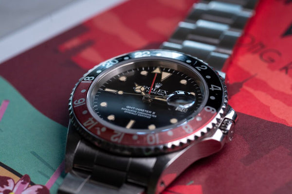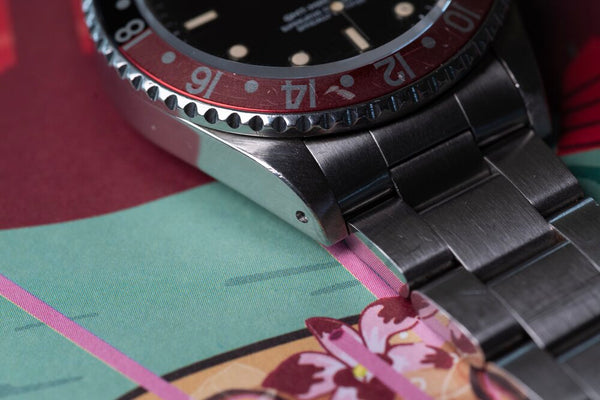 Description: 1985 16760 Fat Lady GMT. One of the rarest GMT references can be considered the 16760 otherwise known as the “Fat Lady.” The nickname was attributed to the increased case size around the lugs and crown guards as well as the overall thickness height of the case. Produced for only a few years and only in a coke bezel variant, these watches were overlooked in the past. Not only does the case size give the watch a completely different feel when compared to their thin counterparts, the coke bezel separates any confusion one may have mistaking it for a regular pepsi GMT. This watch in particular has an amazing intense yellow lume that stands out against the red and black coke bezel. Luckily for the future owner, this watch comes with 2 bezels, one slightly more faded than the other. The watch has also an engraving on the case back that says “CAPT. TOM MECHLIN - SEPTEMBER 18TH 1995”