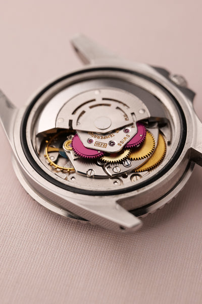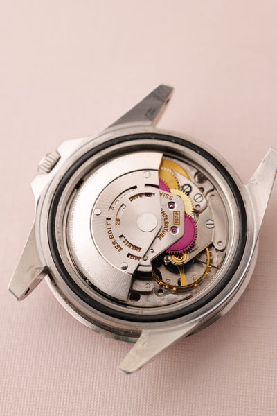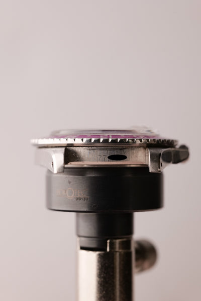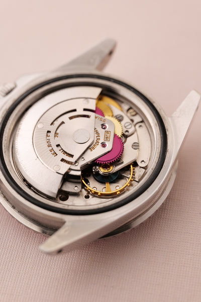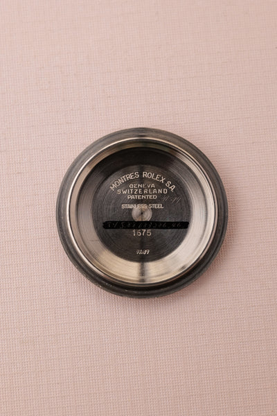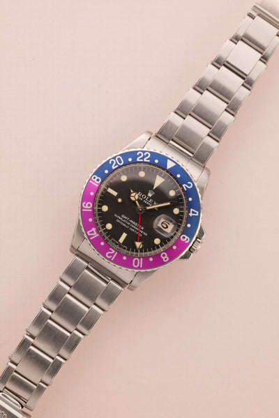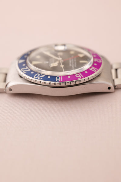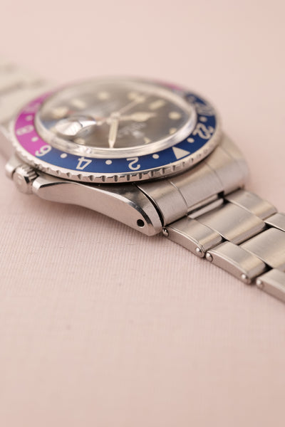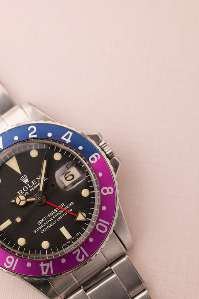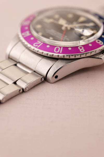 Description: Perhaps the most popular matte dial 1675 is the Long-E MK0-1 variant due to its early production and ability to accept the infamous fuchsia insert. The Mk0.5 is considered to be rare and unique due to the zinc sulfide tritium mixture that still reacts under UV. The combination of being this early reference and beautiful Fuchsia insert is ahard hitter and will no doubt be recognizable to most collectors. This particular 1675 has a very vibrant fuchsia insert. These inserts started life as pepsi inserts but due to the elements these early 1675 inserts tended to turn a purplish pink color. The case is in excellent condition as well and has beautifully sharp fat thick bevels. The patina on the lume is a bright yellow and contrasts really well against the pastel fuchsia insert.