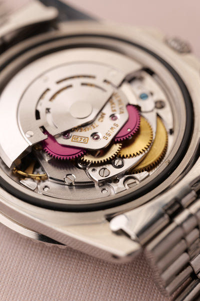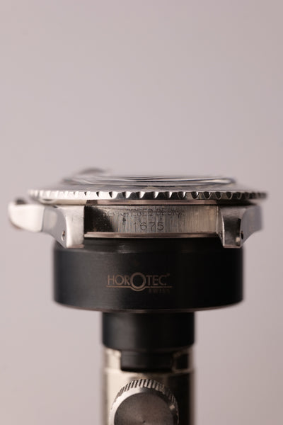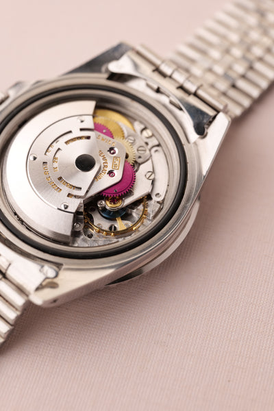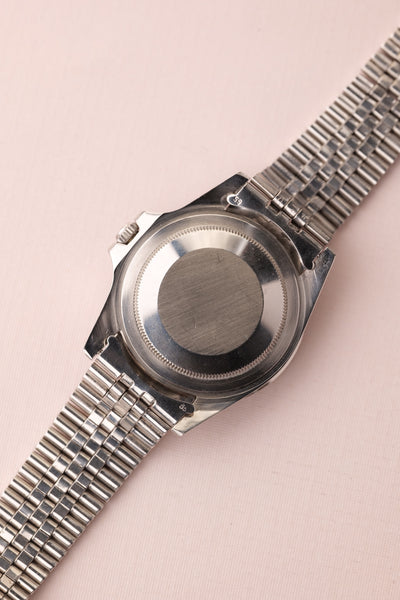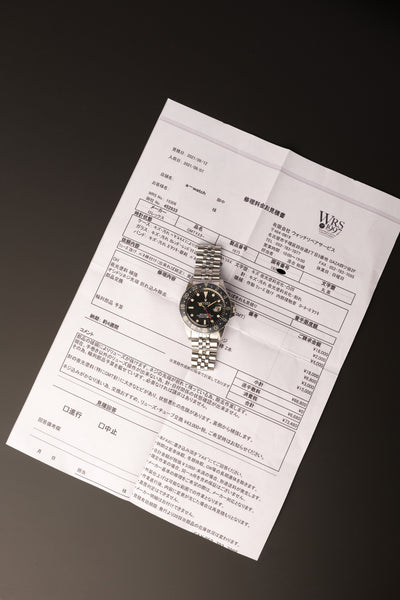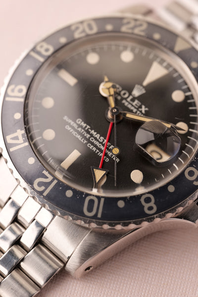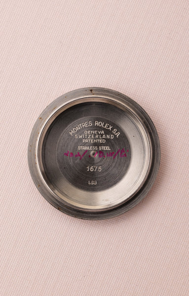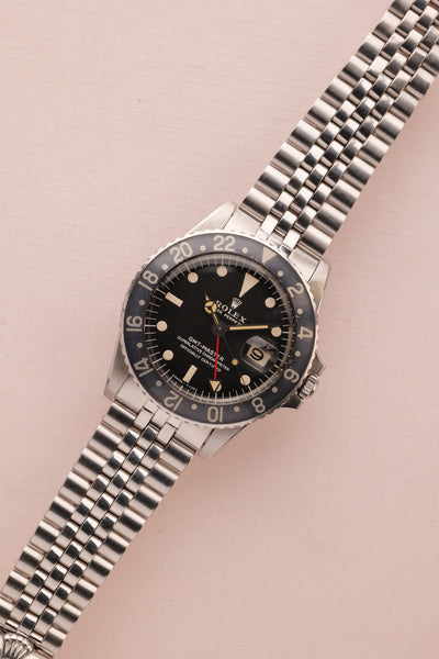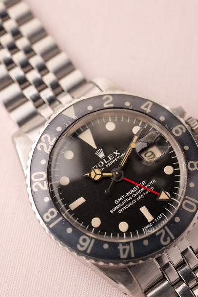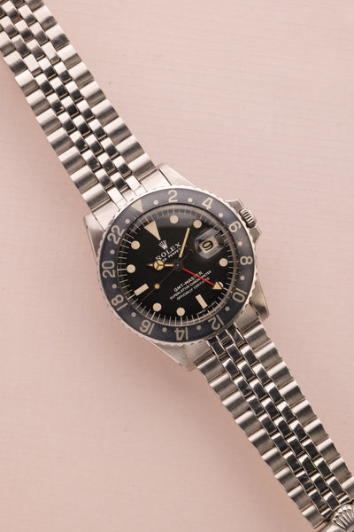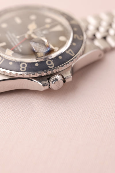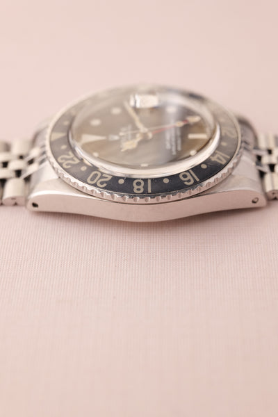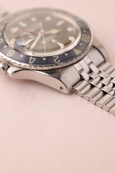 Description: 1968 Rolex MK1 “long e” 1675 GMT. Excellent condition tritium maxi dial with plump yellow lume. Case retains factory bevels and in our estimation likely unpolished . Excellent condition jubilee bracelet. Mark 1 dial with original tritium hands. The insert has faded from a black insert into a mulberry toned purple that contrasts nicely against the yellow lume.
