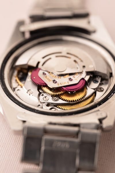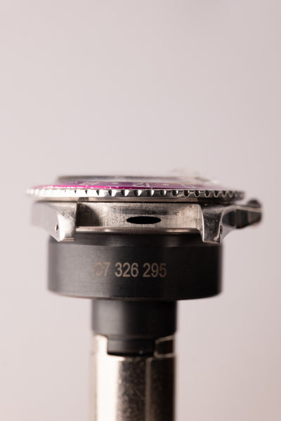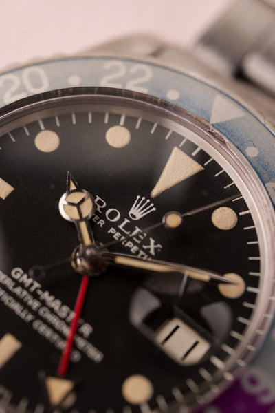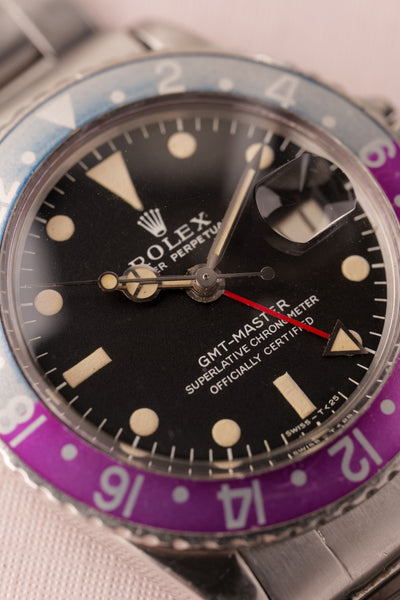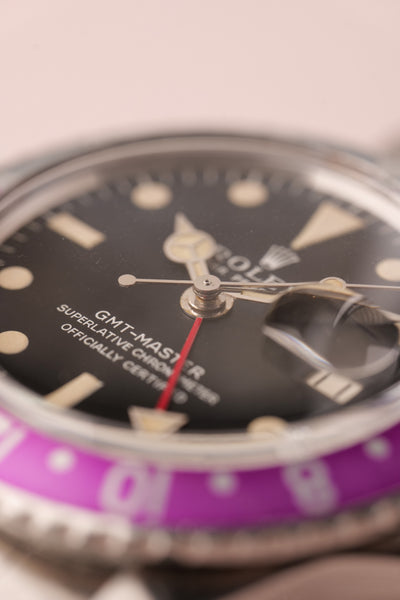 Description: Perhaps the most popular matte dial 1675 is the Long-E MK1 variant due to its ability to accept the infamous fuchsia insert. This combination is a hard hitter and will no doubt be recognizable to most collectors. This particular 1675 has a beautifully faded fuchsia insert. These inserts started life as pepsi inserts but due to the elements these early 1675 inserts tended to turn fuchsia. The case is in excellent condition as well and has beautifully sharp bevels. The patina on the lume is a bright yellow and contrasts really well against the pastel fuchsia insert.