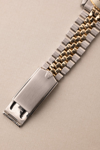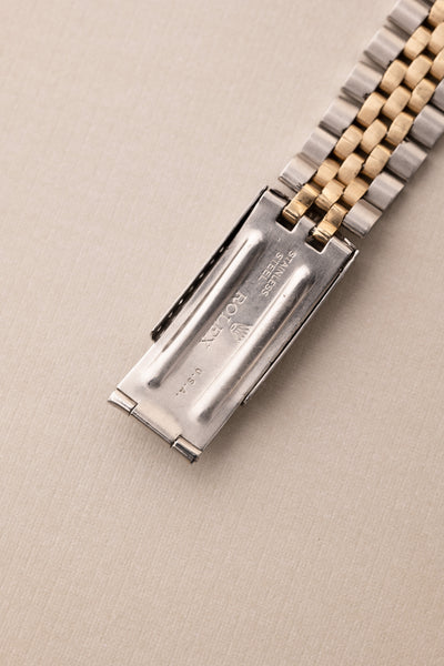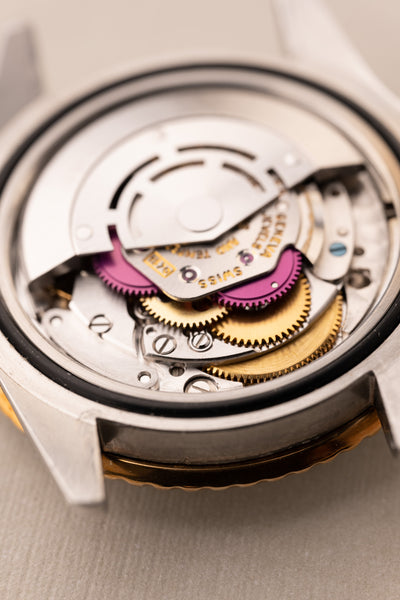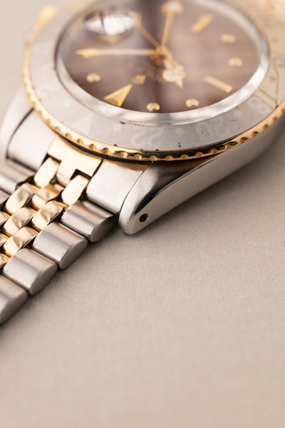 Description: 1973 Rolex Applied logo Dial 1675 GMT. This two-tone GMT is simply gorgeous. It boasts a nipple dial that is oxblood and maroon in color these early two-tone dials featured an applied rolex crown on the dial. These dials were shared with the all gold 1675 variant Lugs appear unpolished as well with original chamfers that are equal in thickness