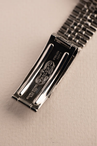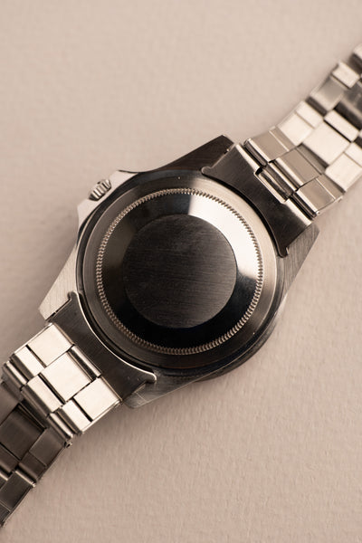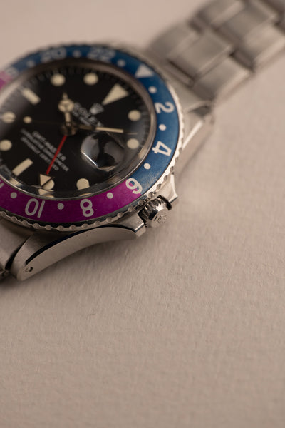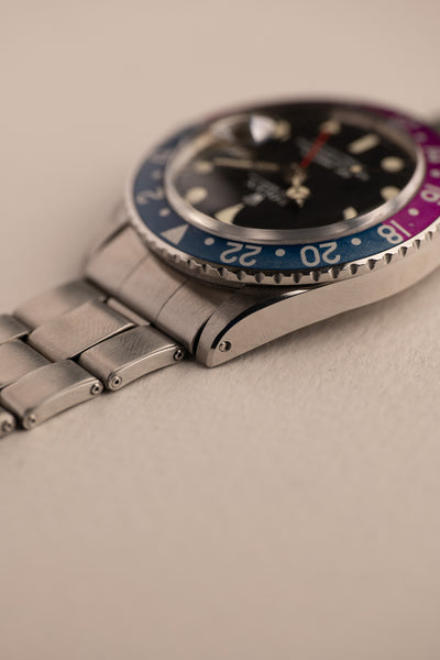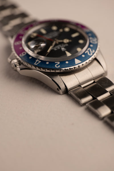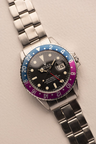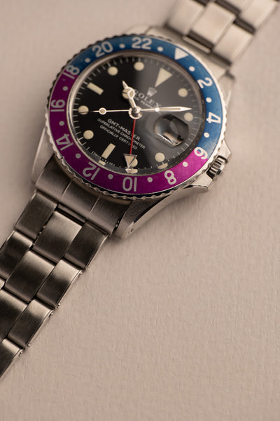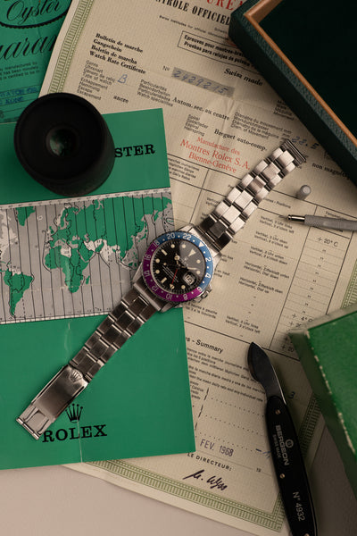 Description: 1969 Rolex 1675 Fuchsia Insert with a long list of features. Perhaps we should start with obvious that this 1675 is a fuchsia era watch, referring to the fuchsia coloring that has developed on these mid to late 60’s 1675’s. The dial is a correct long E dial, but if you look closer you will see that it is an early Long E dial commonly referred to as a MK0.5 Day-Glow dial. These dials were transitional dials that Rolex used with experimental lume. The common belief is that the tritium mixture was mixed with Zinc-Sulfide which allows the tritium to still react to Intense UV light. Because of this feature, the dial is also nick named the day glow as it appears as if it’s sometimes glowing during the day. This 1675 has an excellent case as well that has recently been polished with thick and even bevels. It comes with chronometer certificate, guarantee papers and a Rolex box.