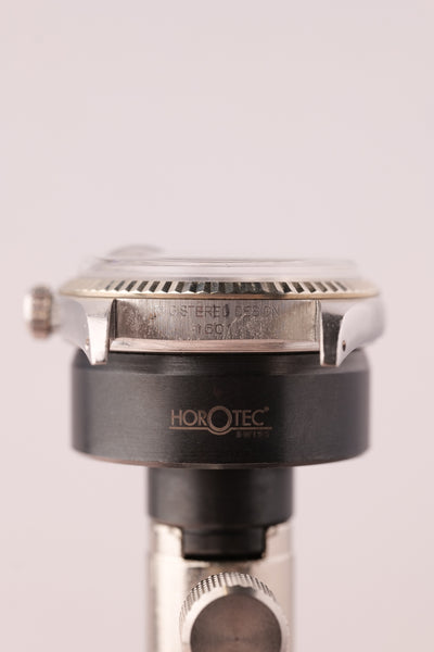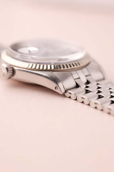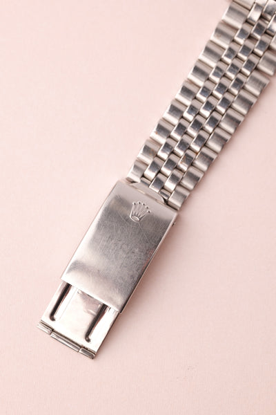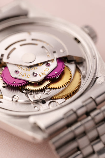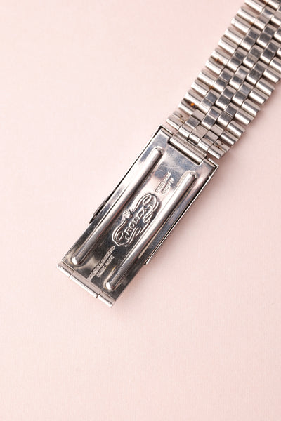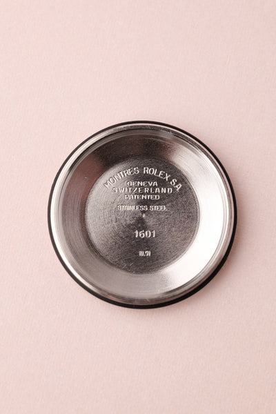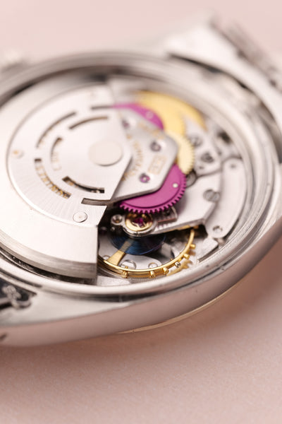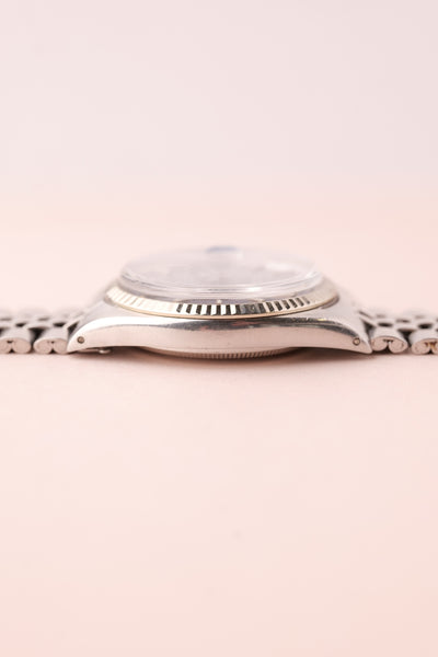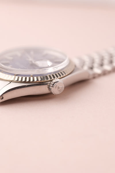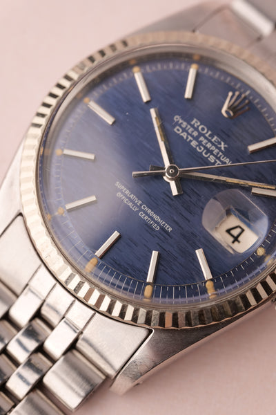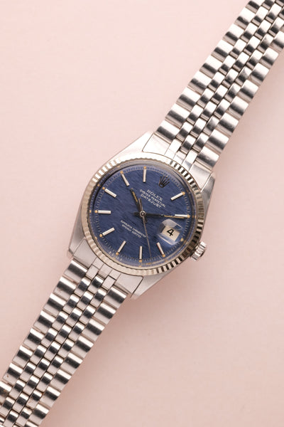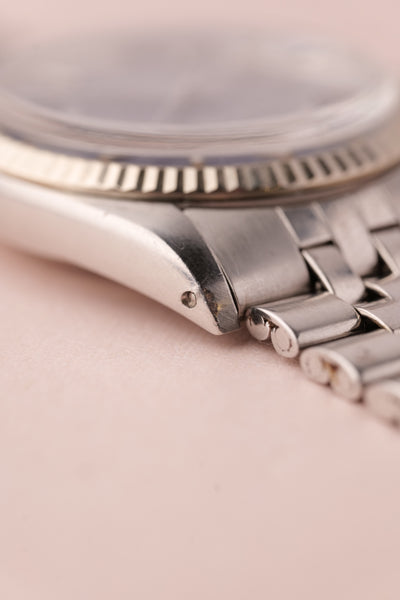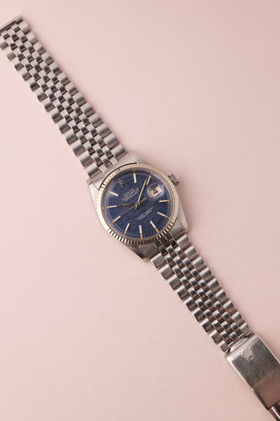 Description: 1970 Mosaic Dial Date-Just. We don’t see many 1601’s paired with a mosaic dial. The dial brings and nice pop of blue with the beautiful mosaic pattern. The dial retains all lume plots and they appear pumpkin colored. The case appears unpolished with thick bevels.