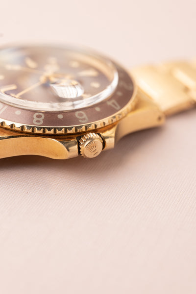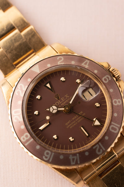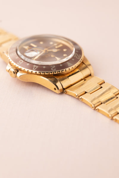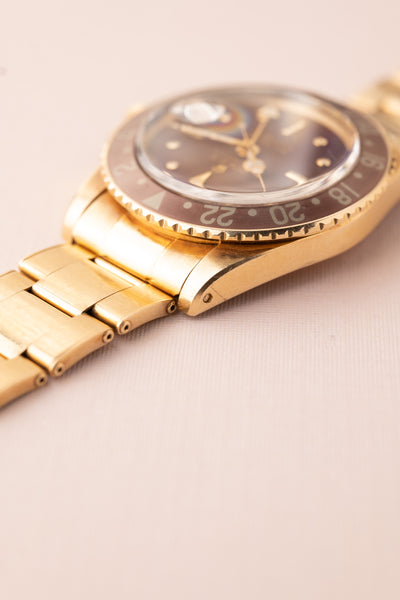 Description: Its no surprise that gold 5 digit watches have taken over by storm. So where does that leave 4 digit gold pieces? It’s safe to say that these have definitely climbed with their 5 digit siblings but as they were made in far fewer numbers, they have gone a bit under the radar as prime well kept examples are being tucked away in major collections. Out of all the gold GMT’s we feel the nipple dial rootbeer is our favorite gold sports model from Rolex. Proportions and heft balance out nicely as is the matte dial oxblood colored dial. If we have to explain the beauty of this piece, it is probably not for you.