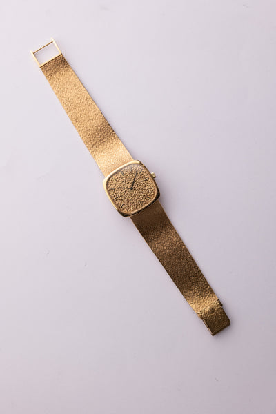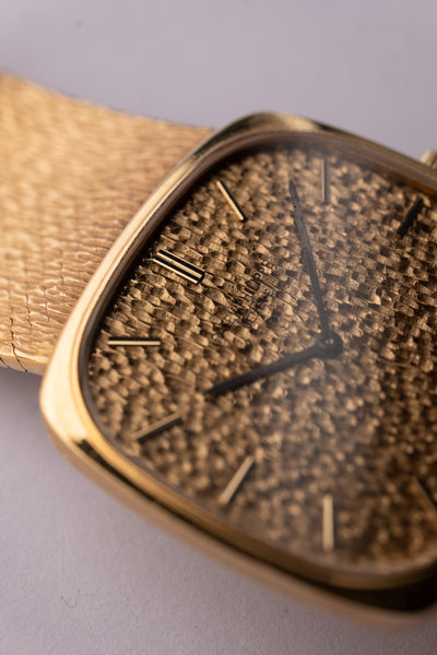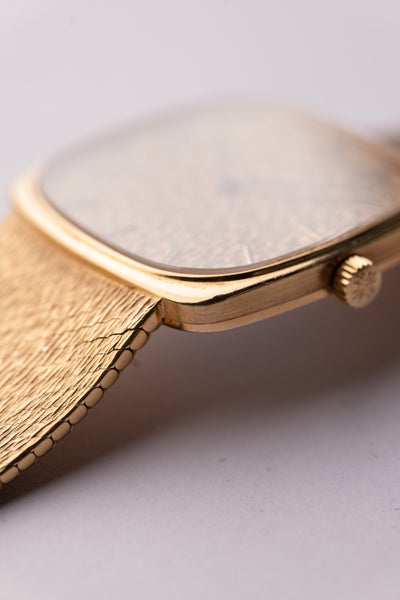 Description: Another beautiful Patek in a cushion shape with bark dial and bracelet.