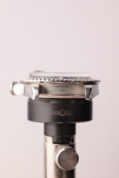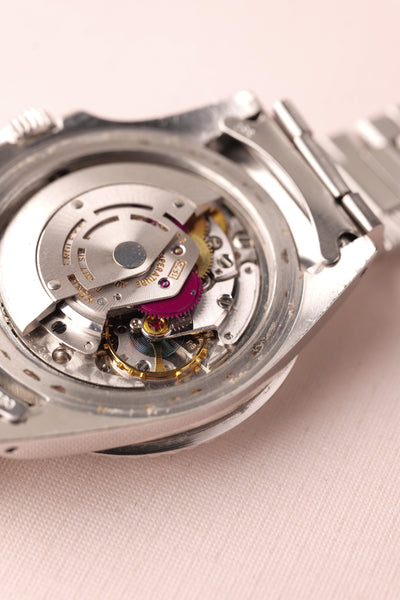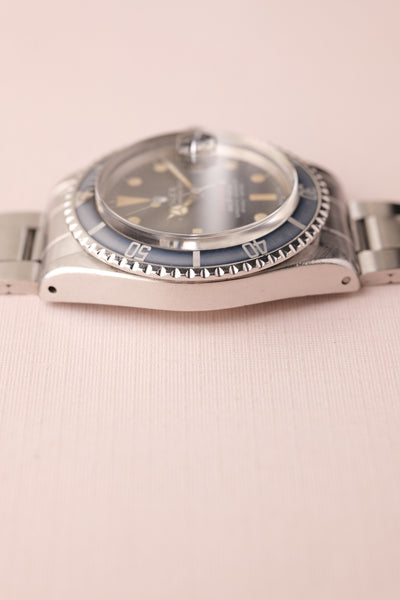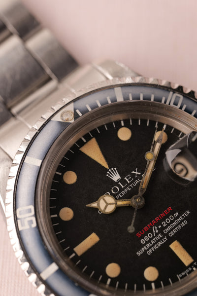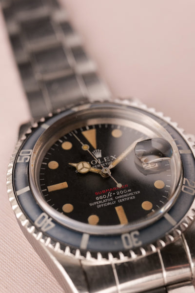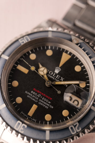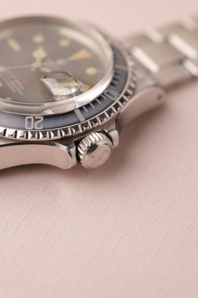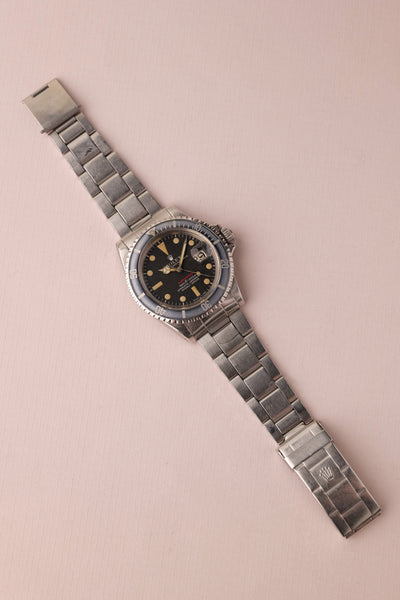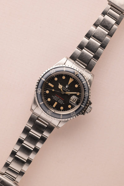 Description: The 1680 Red Submariner was the earliest dated Submariner reference. These early “red-Subs” highlighted by their iconic red text, are highly sought after. This variant is a MK5 “ft-first” variant and is correct to the watch. The lume has a distinguished coloring that contrasts beautifully against the faded blue insert.