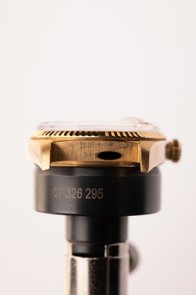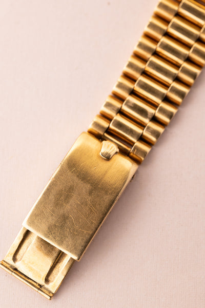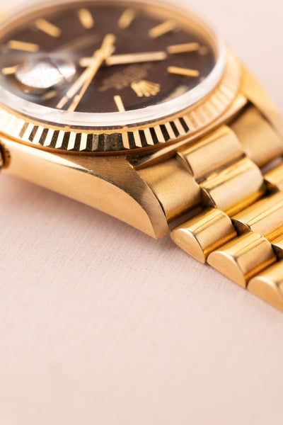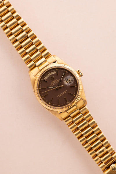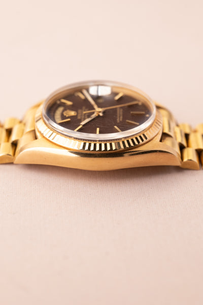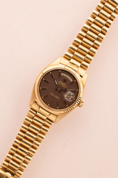 Description: One of the rarer Day-Date dials is the brown confetti dial which is typically seen with black and red speckles. This however is even rarer than that. It is an oxblood brown similar to those seen in the early gold 1675 dials. The case is very thick and beautiful with oxidized patina throughout the case