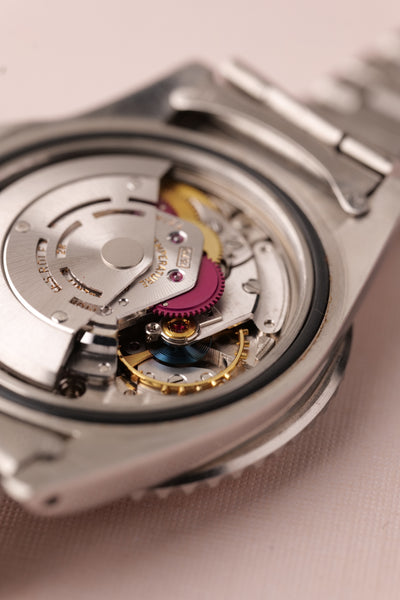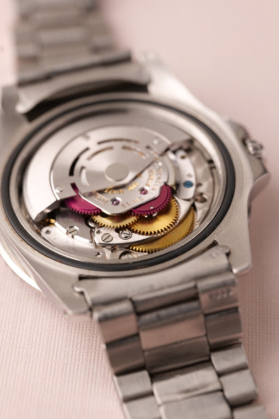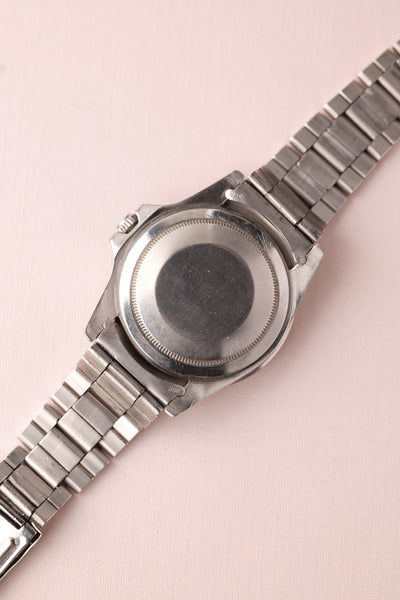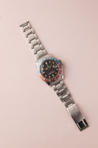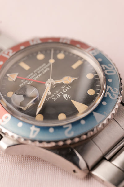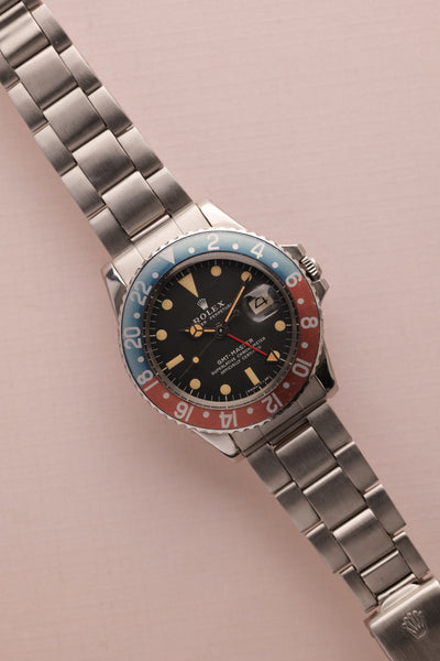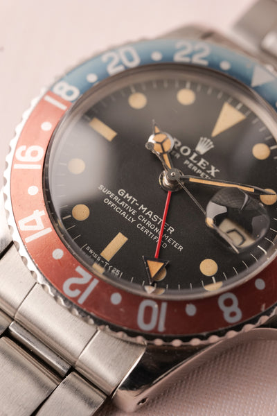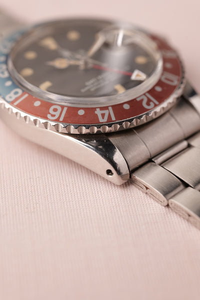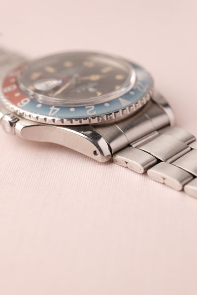 Description: Rolex Pepsi GMT with MK2 dial. The MK2 1675 is characterized by a fat L in “Rolex” This chunkier font leads to a pleasing contrast when coupled with the saturated lume plots. The case is also exceptional on this GMT given the look of the chamfers on the lugs.