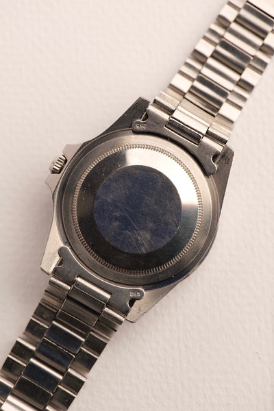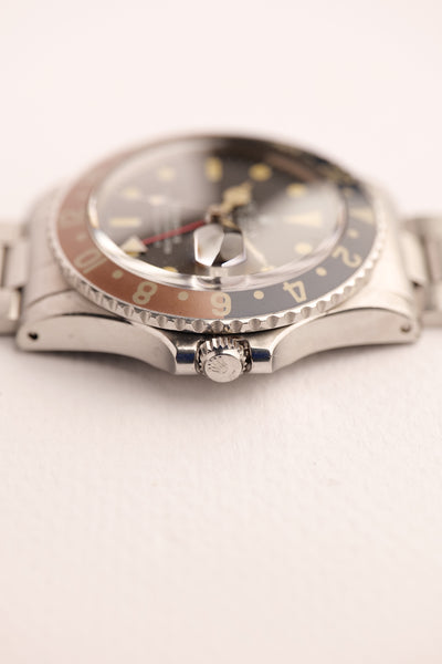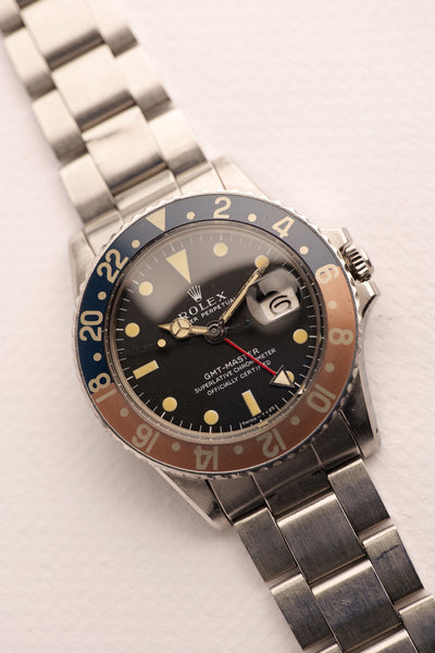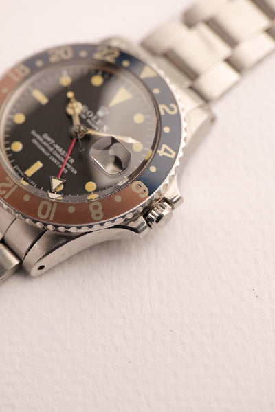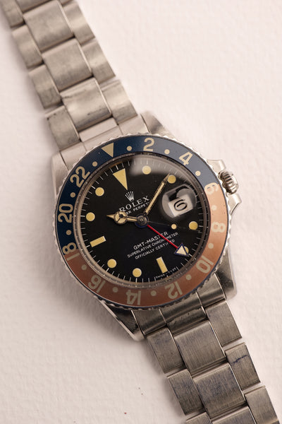 Description: 1972 Matte Dial 1675 GMT. Excellent dial, with color matched hands. Insert is a fat font pepsi insert that has faded beautifully.