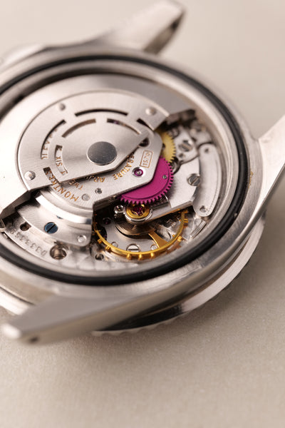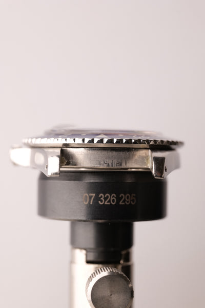 Description: Rolex Pepsi Insert GMT with MK2 dial. The MK2 1675 is characterized by a fat L in “Rolex” This chunkier font leads to a pleasing contrast when coupled with the saturated lume plots. The case is also exceptional on this GMT appears lightly polished with very thick bevels that look sleeve worn. The pepsi insert makes the dial really pop. Hands have been color matched to the dial