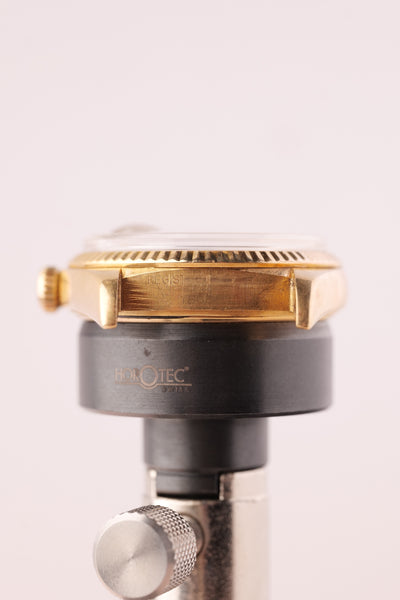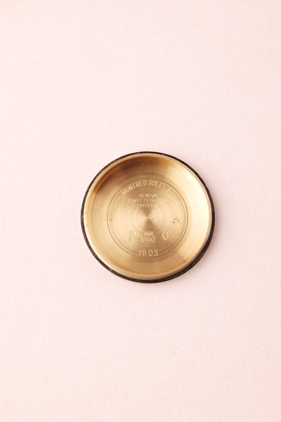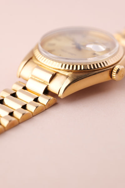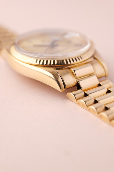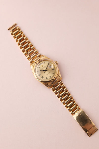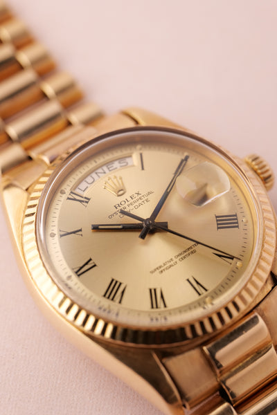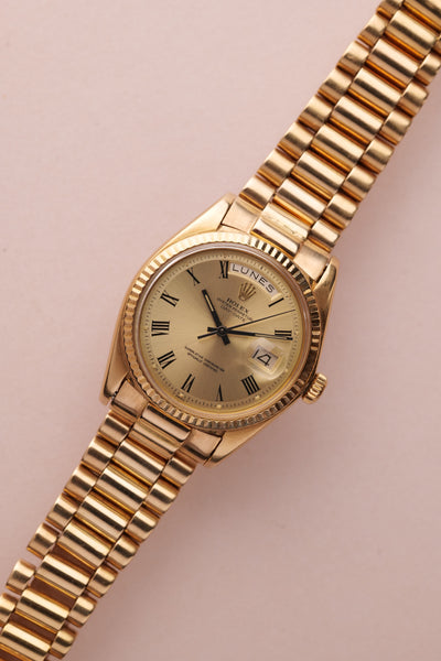 Description: A unique reason to collect the 1803 day-date variant is the abundance of dial variations that this precious metal watch came with from Rolex. These Roman dials have a cult like following and are often referred to as Buckley dials. What makes this one so unique is that this comes with factory black hands that match the black and gold dial. Perhaps a John Player Special inspired 1803 day-date