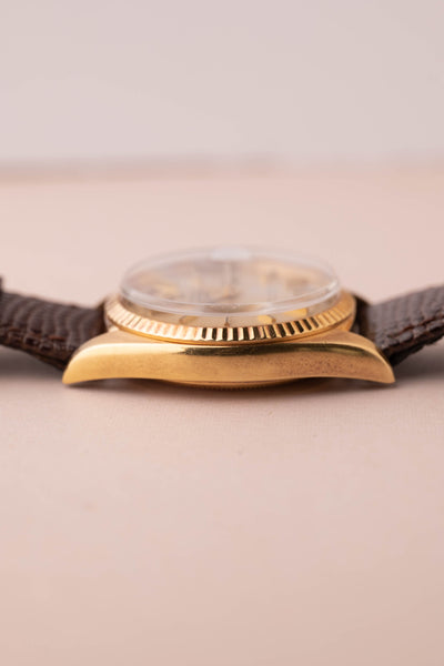 Description: 1972 Rolex 1803 Day-date with champagne dial. This specific dial variant is without luminious plots. The hands and dial are filled in with an onyx like inlay that contrasts beautifully against the yellow gold dial and case. The case appears unpolished and is thick and even throughout. This 1803 day-date comes with a lizard Rolex strap and is one of the best conditioned 1803’s we’ve ever come across.