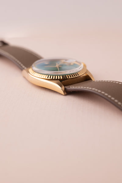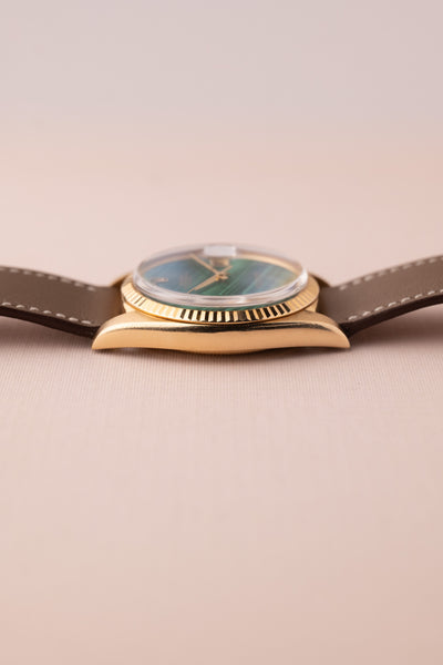 Description: This 1973 Rolex 1601 with a green Malachite Stone Dial is something truly special. These natural stone dials are each unique in a very special way. This Malachite dial swoops in diagonally from 11 to 5. There are no cracks present which is a rather somewhat common attribute on these dials. Since each stone is not manufactured, rather cut and made from stone, there will be inclusions and fissures which is what makes each stone unique.