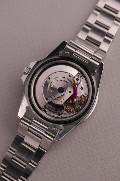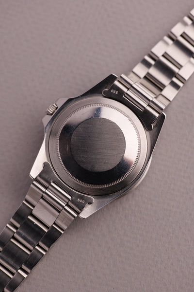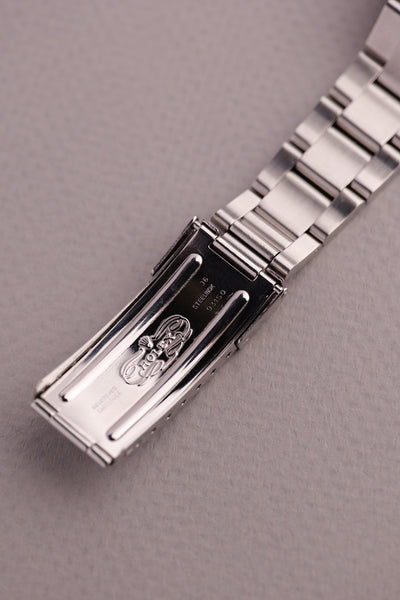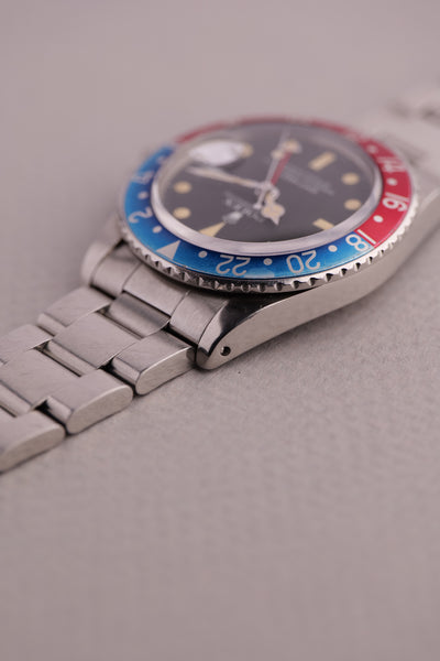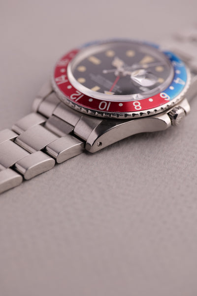 Description: A characteristic of the MK5 dial Rolex 1675 GMT’s are its noticeably bigger dial plots. And that’s a good thing when it comes to this pepsi 1675 since the lume is to die for. Our favorite color lume is the vibrant yellow patina lume that is seldomly seen in this reference. The fat font insert is lightly faded but still remains vividly shiny to match the vibrant dial. Case is very thick and in excellent condition.