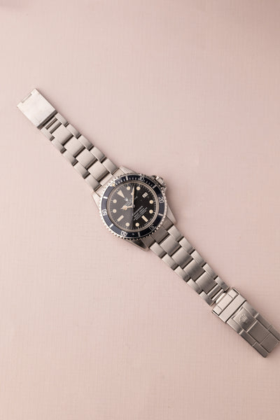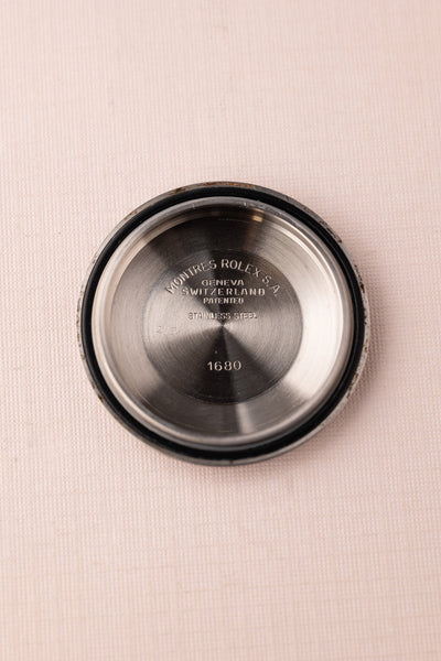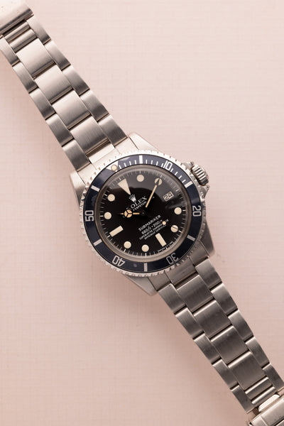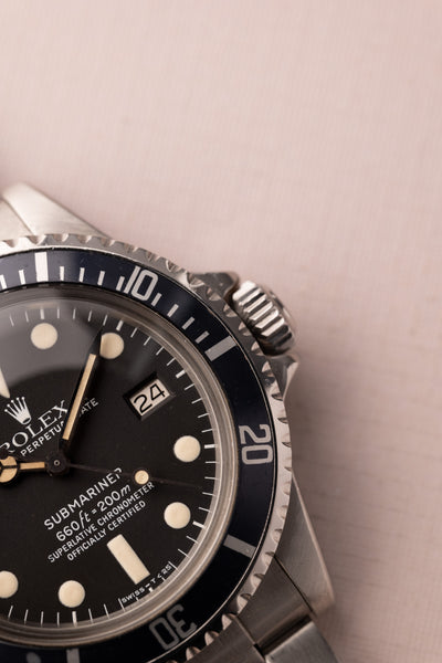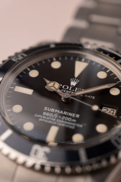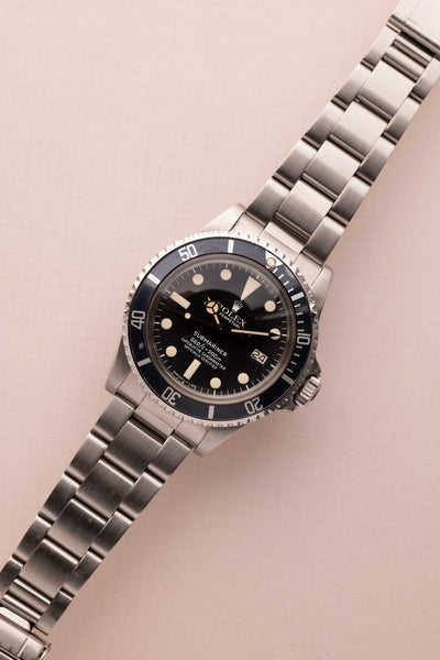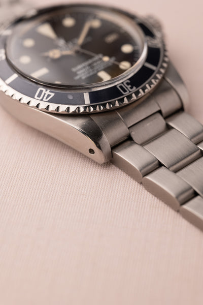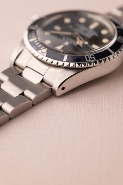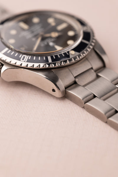 Description: This 1680 Submariner is in excellent condition. The lume exhibits a light yellow patina and is complimented by a slate blue hue insert. Case is thick and even and appears lightly polished, if not unpolished, given the bevels and overall case appearance.