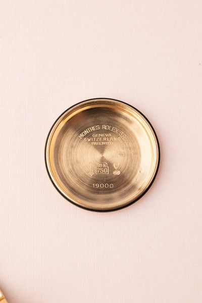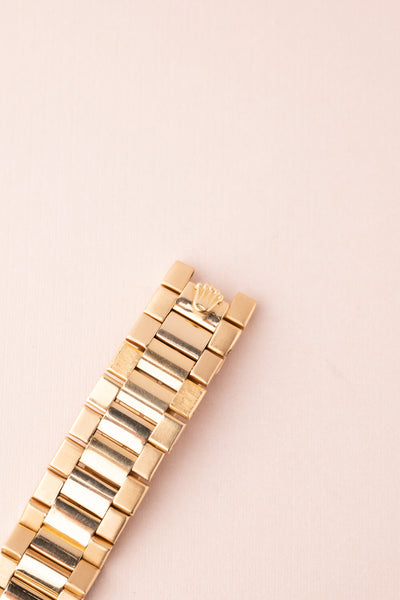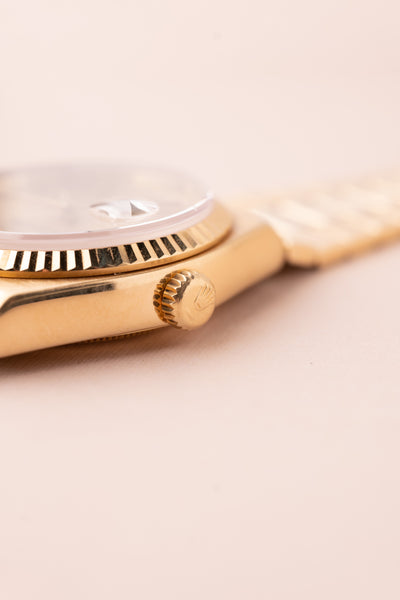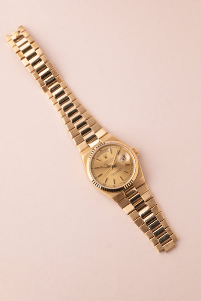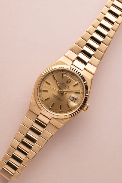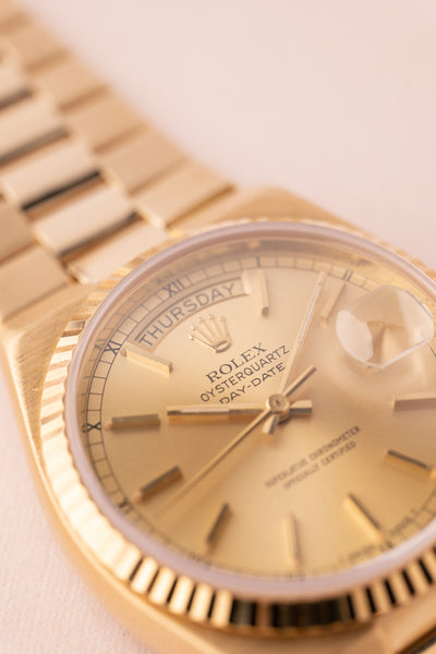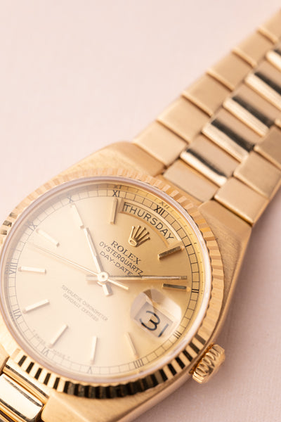 Description: Beautiful all yellow gold OysterQuartz Day-Date paired with a champagne dial. Watch has been previously polished but is in great condition with the lugs thick and even all around.