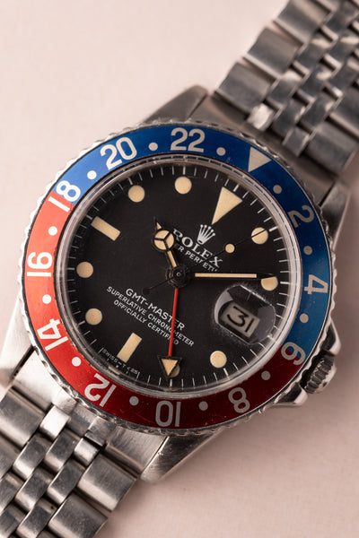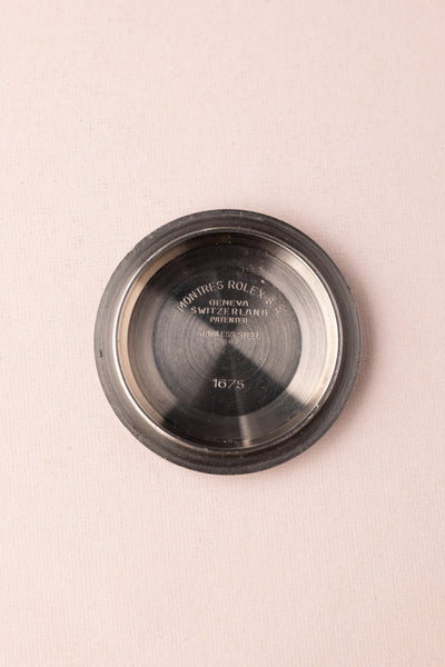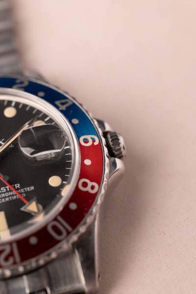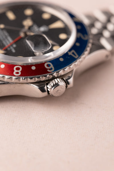 Description: The MK4 1675 sometimes exhibits the biggest plots out of any 1675 GMT. It seems like the later 70’s era sports watches from Rolex feature this larger lume plot than their earlier counterparts. This GMT certainly does not disappoint. Some key features to highlight are the excellent dial and beautiful colored lume plots and lightly faded pepsi insert. The other stand-out feature is the very thick and previously lightly polished case. You can really tell the thickness of a case by the lug and crownguard thickness. All appear very even, and perhaps a light polish from a skilled polisher can highlight the bevels once more. This GMT made it’s way to our doorsteps from Mexico, and has largely been with one owner.