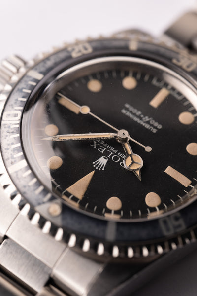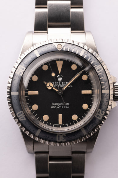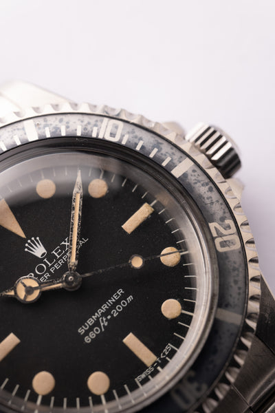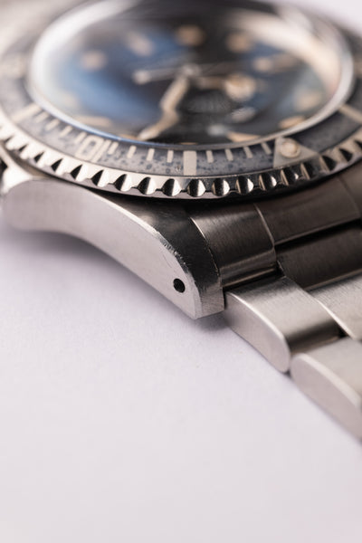Description: Beautiful maxi 3 “Lollipop” 5513 Submariner. The late 70’s 5513 Submariners introduced the maxi sized large lume plots for the first time ever. Of the 5 maxi variants, the Maxi 3 is typically known to have the biggest plots, and its nickname “lollipop” is due to the lume plots often touching the hash marks on the outer edge of the dial, making them resemble lollipops. This maxi 3 has a beautifully faded insert, warm custard lume, and an excellent case with sharp bevels.