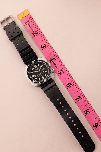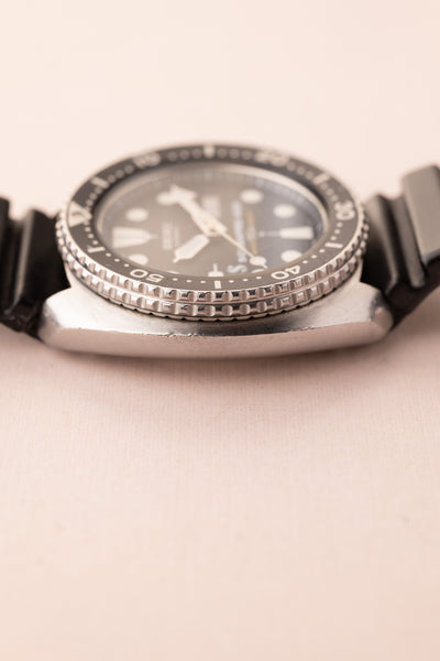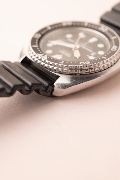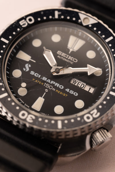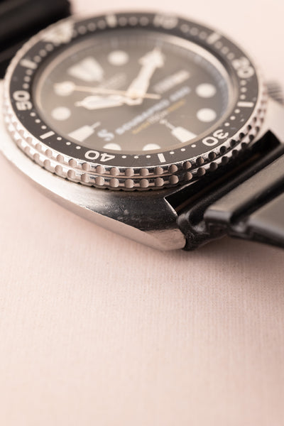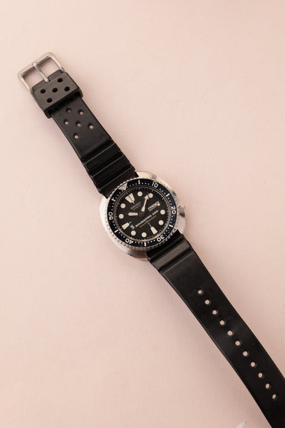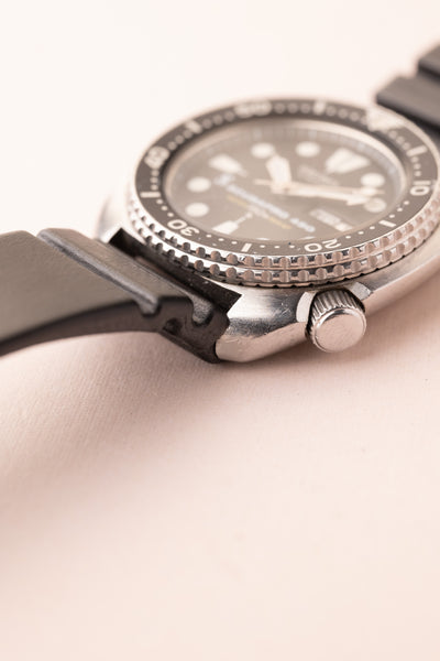 Description: The Seiko Turtle is an iconic dive watch. The 6306 variant was a Japan domestic release watch that features both English and Japanese days. What makes this turtle truly special is that this is a double named watch, that was co-branded with the diving tool company Scubapro. These rare birds are an affordable entry into something truly rare and special. It is believed that there is less than 1000 of these made and were only distributed to the Japanese market. This watch is unpolished and retains light yellow lume.