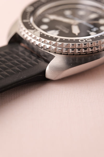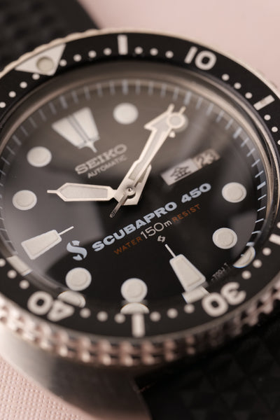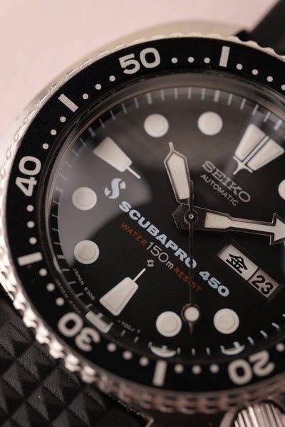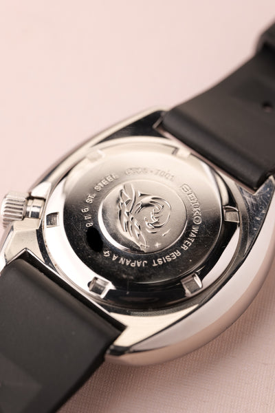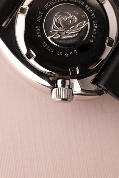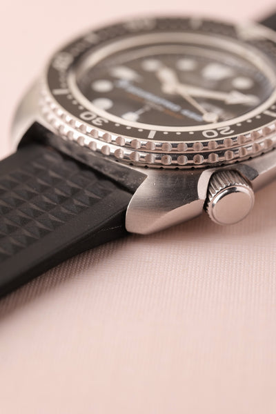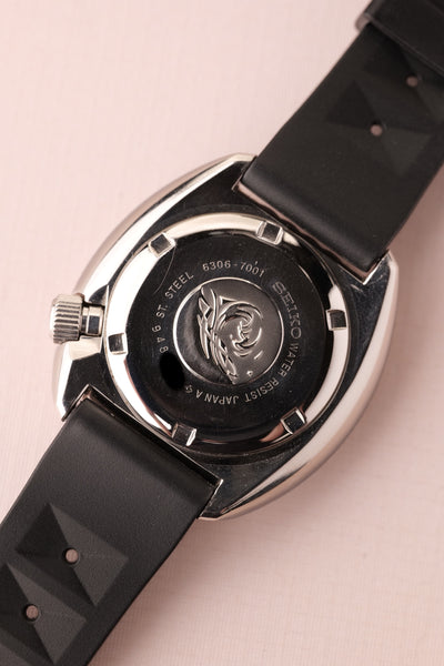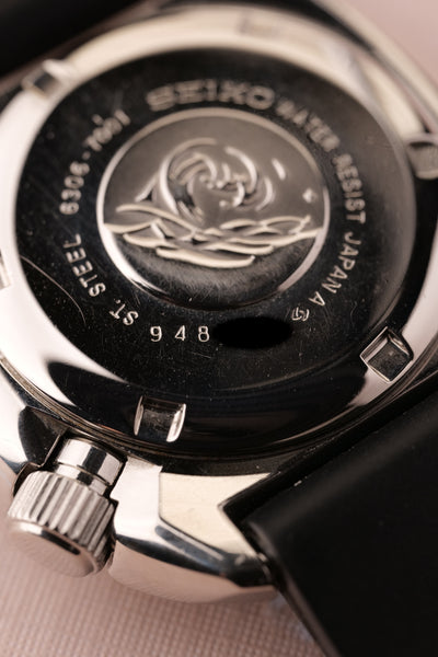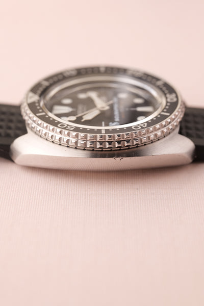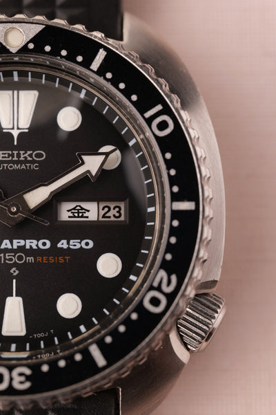 Description: The Seiko Turtle is an iconic dive watch. The 6306 variant was a Japan domestic release watch that features both English and Japanese days. What makes this turtle truly special is that this is a double named watch, that was co-branded with the diving tool company Scubapro. These rare birds are an affordable entry into something truly rare and special. It is believed that there is less than 1000 of these made and were only distributed to the Japanese market. This watch in particular is one of the nicest we’ve ever seen. Recently serviced from Japan this watch is in great condition. With a light polish the case remains super sharp. The domed crystal which is aftermarket makes the dial really pop along with the Uncle Seiko Strap. Original Crystal and Strap are included with the watch along with the service papers. If you are looking for something special this is it.