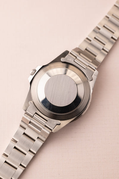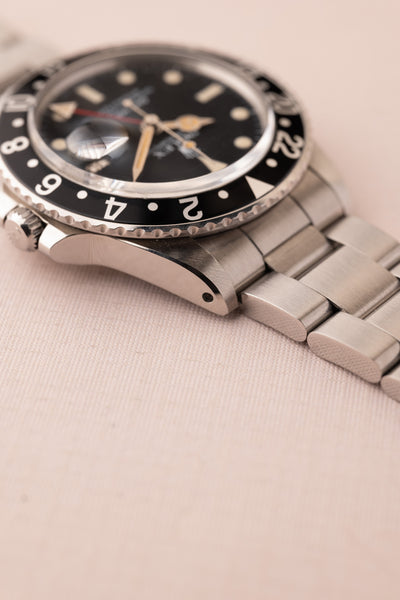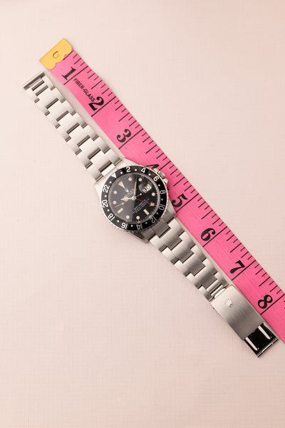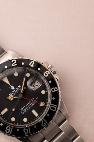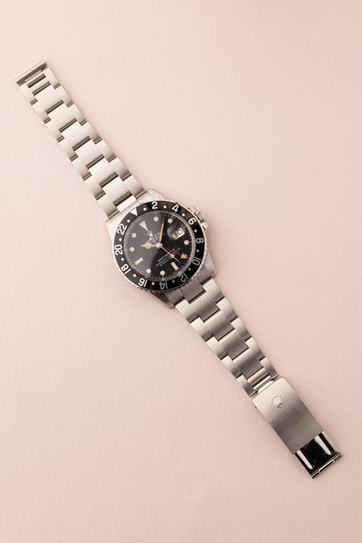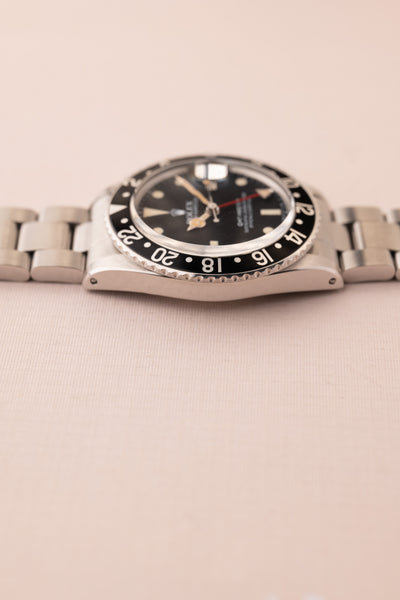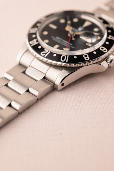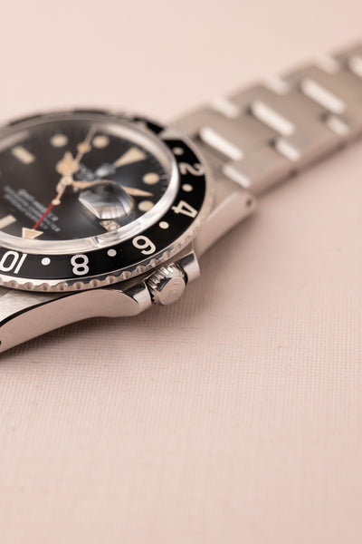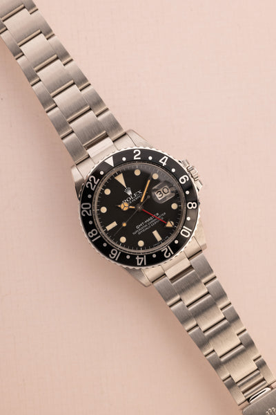 Description: When we get asked what Rolex are the best investments without having to give up an arm and a leg, we point them to neo-vintage pieces. The 16750 GMT sits on the early side of the neo-vintage scale coming shortly after the 1675 classic plexiglass variant. This 16750 has a beautiful matte dial and yellow vibrant lume with a black insert. The case is in great condition with a recent polish everything remains super thick and even all around.