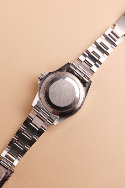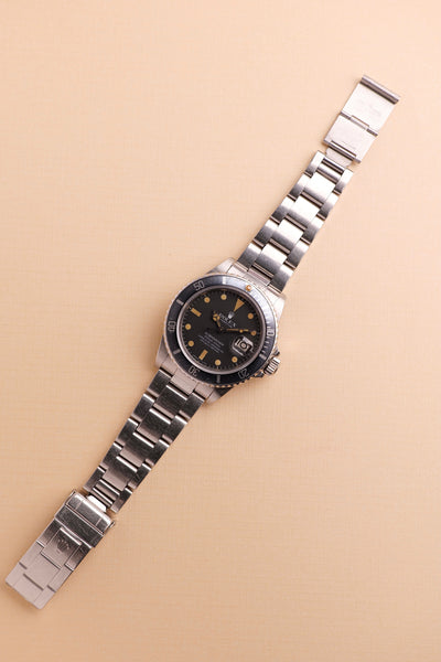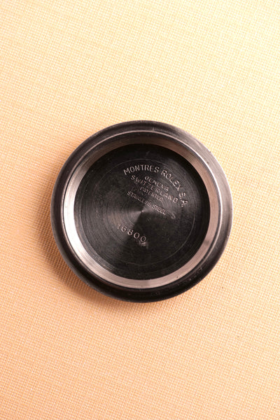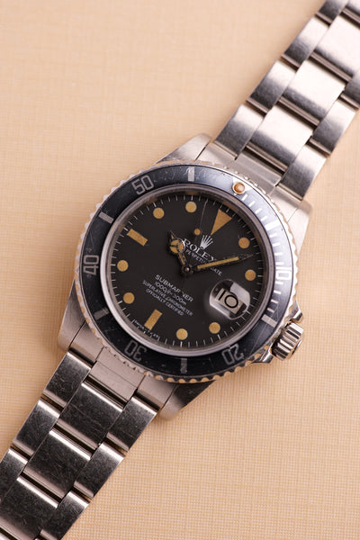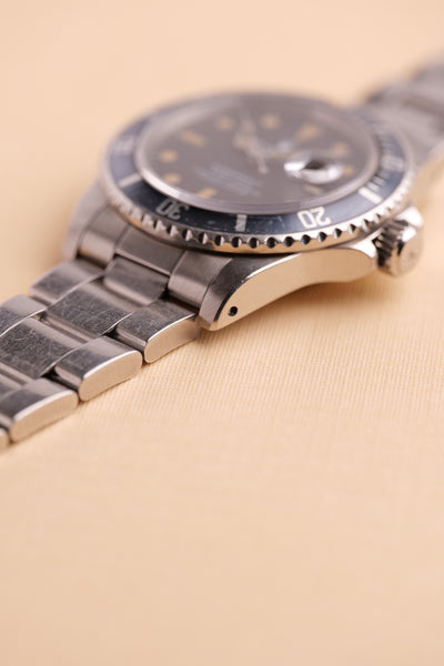 Description: This 16800 is all about the colors. A deep saturated yellow patina on the dial is surrounded by a beautifully shimmering yet faded blue bezel. We especially love that this is one of the matte dial variants which makes it much more rare than the later WGS dials.