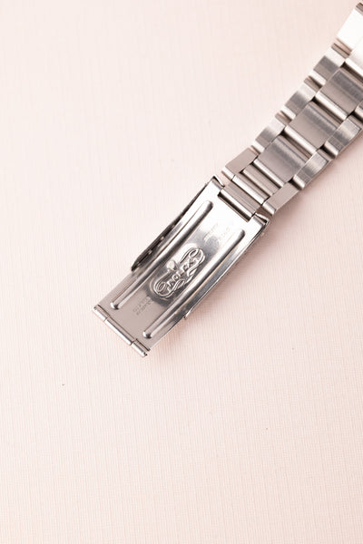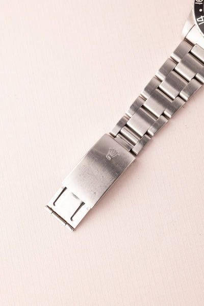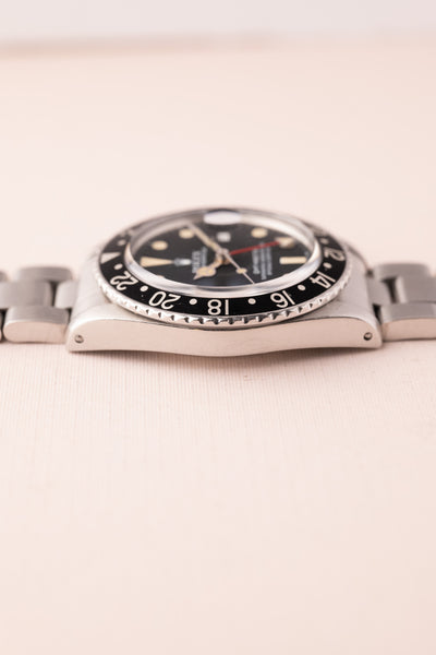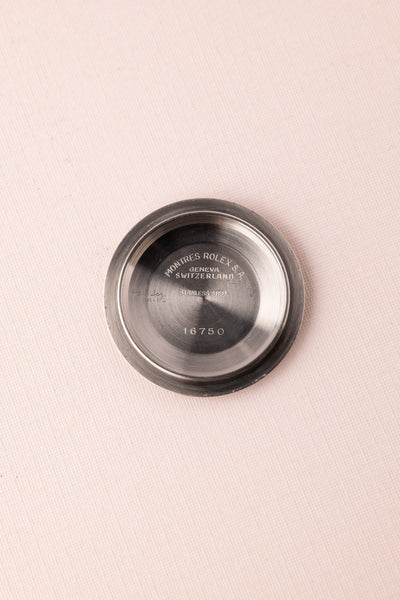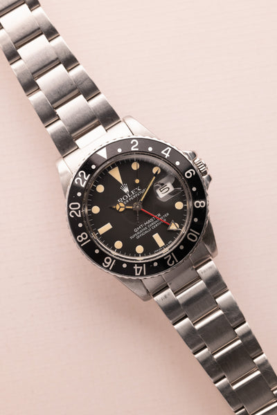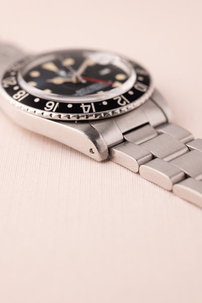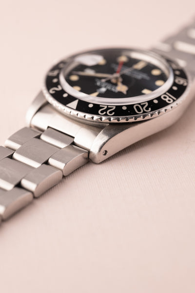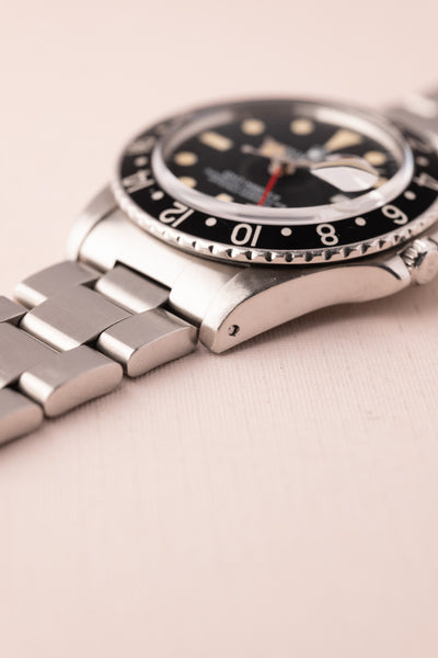Description: When we get asked what Rolex are the best investments without having to give up an arm and a leg, we point them to neo-vintage pieces. The 16750 GMT sits on the early side of the neo-vintage scale coming shortly after the 1675 classic plexiglass variant. This 16750 has a beautiful matte dial and yellow vibrant lume with a black insert. There is a slight circular mark from a light hand drag near the center of the dial. The case appears in excellent condition with thick lugs and “sleeve polished” edges.
