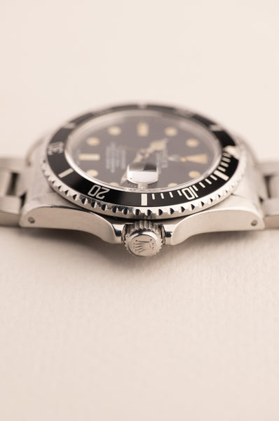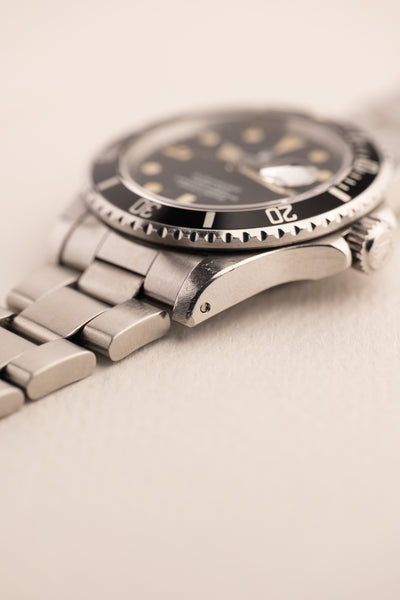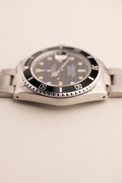 Description: Matte dial 16800’s are a rare bird when it comes to Neo-Vintage Submariners. Made only for a few years before Rolex transitioned to the white gold surround dials that they still use to this day. It is a perfect blend of the matte dials that we are familiar of from the 4 digit submariners but it takes one step towards modern Rolex with the sapphire crystal. This particular 16800 is unpolished with sharp original bevels and crown guards. The dial has a pleasant yellow lume and has a yellowish hue when seen under sunlight.