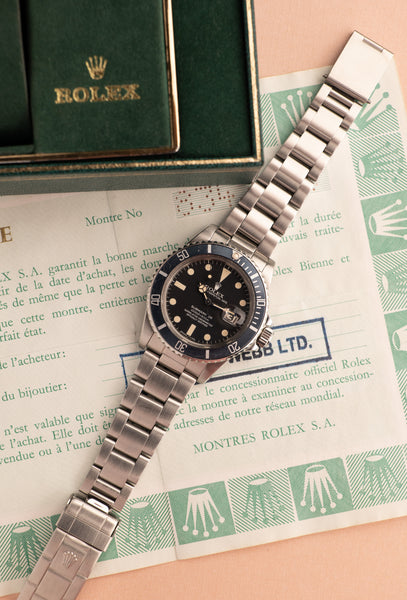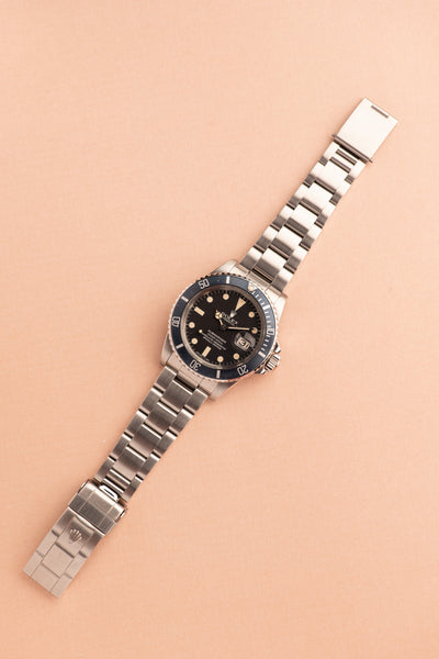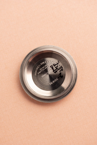 Description: Matte dial 16800’s are a rare bird when it comes to Neo-Vintage Submariners. Made only for a few years before Rolex transitioned to the white gold surround dials that they still use to this day. It is a perfect blend of the matte dials that we are familiar of from the 4 digit submariners but it takes one step towards modern Rolex with the sapphire crystal. This particular 16800 is has an amazing insert that has faded into a navy blue over the years. The case is thick and even and has been lightly polished in the past. The hands have been color matched while the dial is original and has a pleasant yellow lume. The watch is complete with box and papers and booklet. The serial is towards the end of 1983 and the beginning of 1984 so it could be either year.