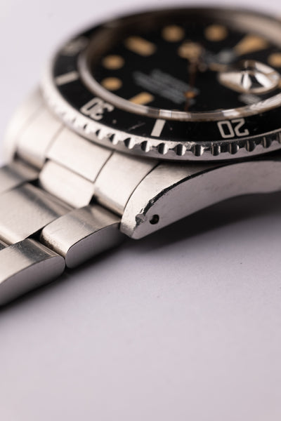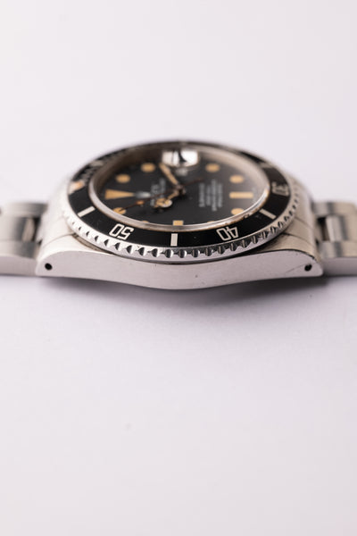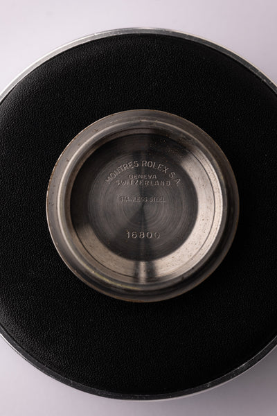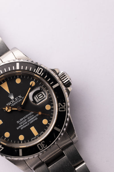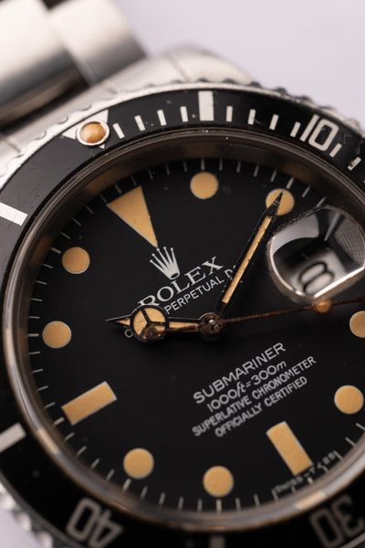 Description: 16800 with a deep saturated yellow patina on the dial is surrounded by a deep black insert. We especially love that this is one of the matte dial variants which makes it much more rare than the later WGS dials.