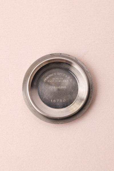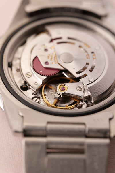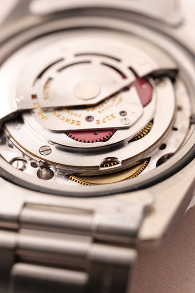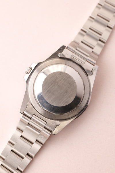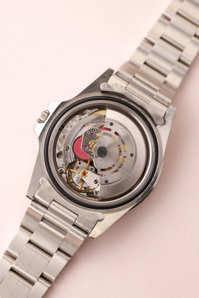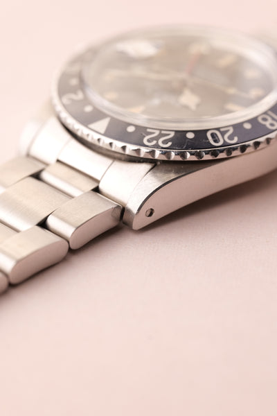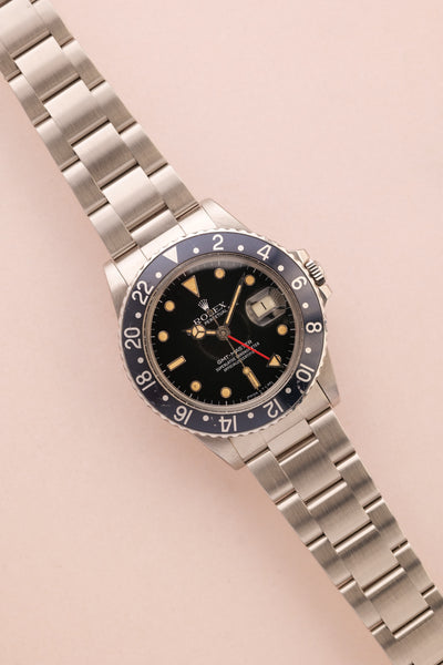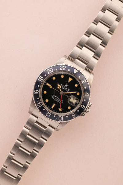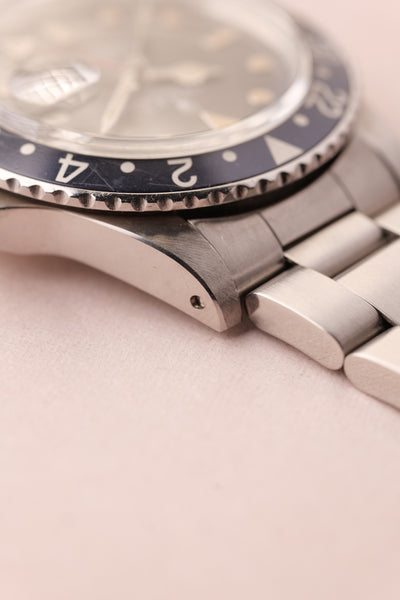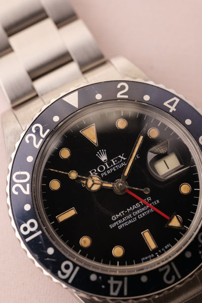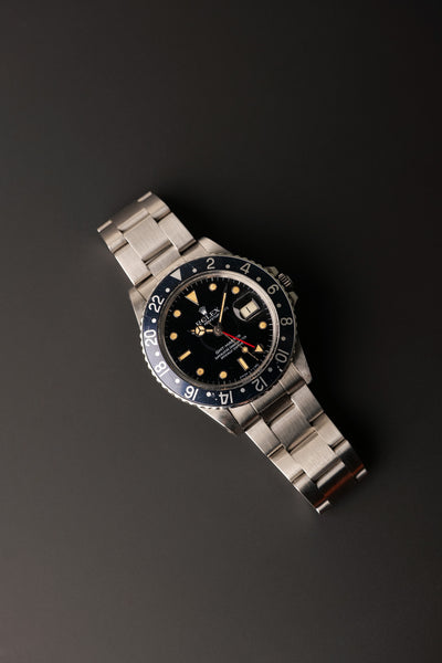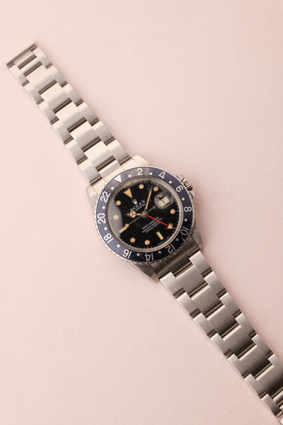 Description: When we get asked what Rolex are the best investments without having to give up an arm and a leg, we point them to neo-vintage pieces. The 16750 GMT sits on the early side of the neo-vintage scale coming shortly after the 1675 classic plexiglass variant. This 16750 has white gold surrounds were introduced to the pepsi gmt in this reference and with the tritium markers provide a warmth of color to the otherwise stark mirror dial.