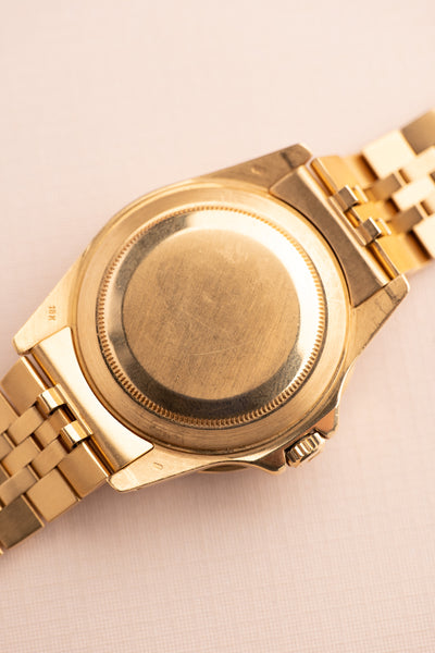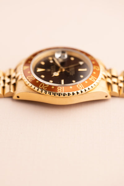 Description: 1984 Rolex Gold 18k 16758 nipple dial GMT is one of our top picks for neo-vintage watches, The watch features an all brown insert and an amazing thick case that has likely been previously lightly polished once. Watch is keeping great time and comes on a thick gold jubilee bracelet.