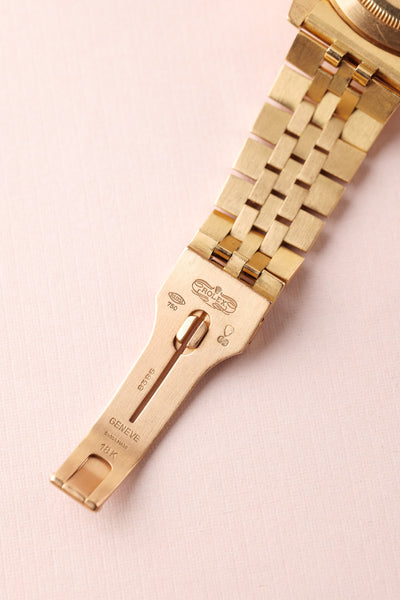 The watch features an all brown insert and an amazing thick case that has likely been previously lightly polished once. The dial has raised nipple indices and has a nice mocha colored brown tone. Watch is keeping great time and comes on a gold jubilee bracelet. The dial has an ever so light hand drag that is only visible in certain angles