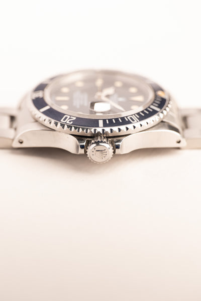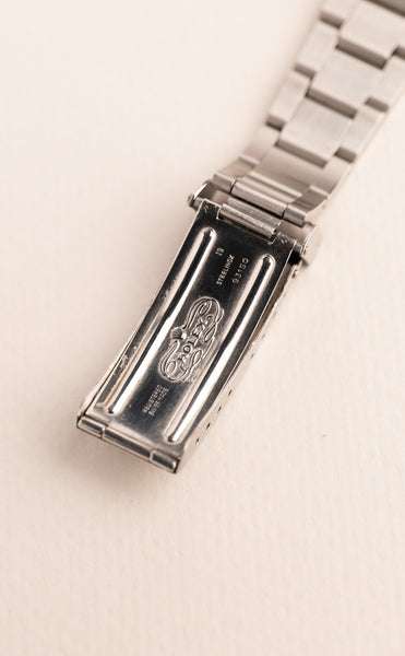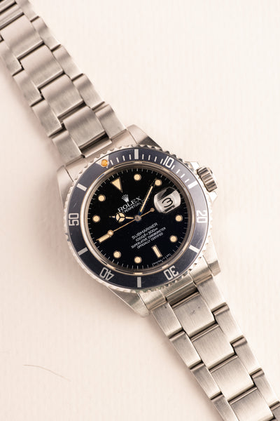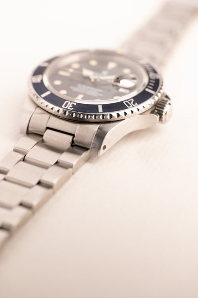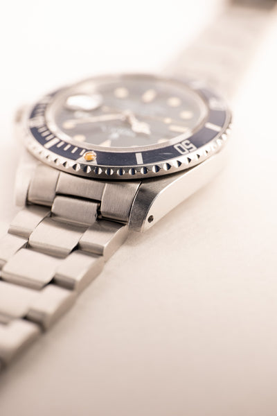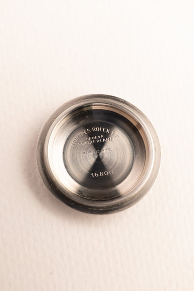 Description: This 16800 is a the perfect daily neo-vintage submariner. The 16800 follows after the plexiglass 1680 and was offered in both a matte dial finish (transitional) and a glossy (white gold surround) dial variant that introduced white gold rings to surround the luminous plots. This gloss dial variant uses tritium and has aged into a beautiful golden yellow that is complimented by the faded black insert that has now aged to a slate blue. The case appears unpolished and is thick and even throughout the watch. Nice sharp beveling along the lugs as well. These 16800 although still affordable in the world of vintage Rolex, are beginning to climb along with anything else that is in this type of collector’s condition.