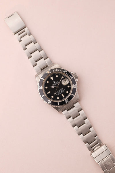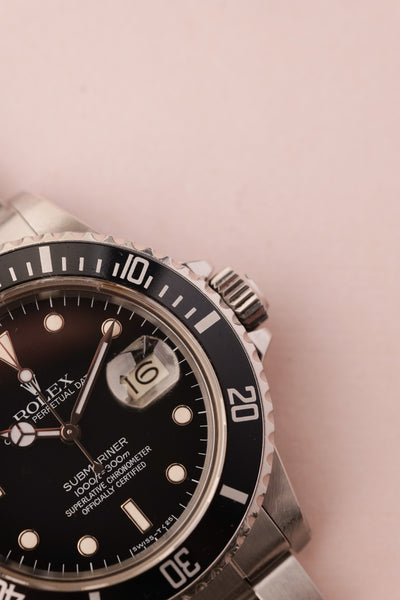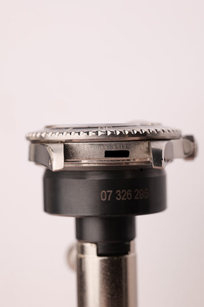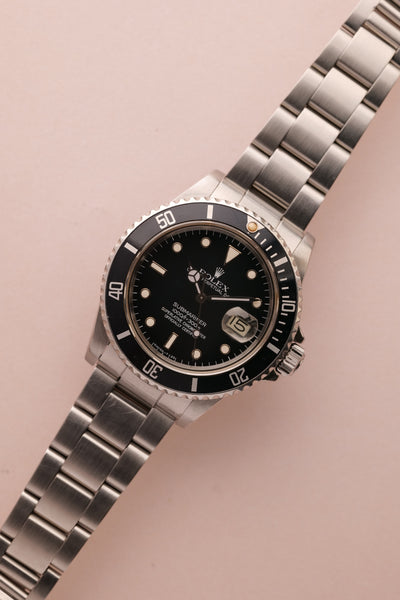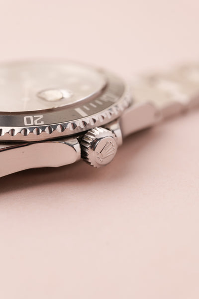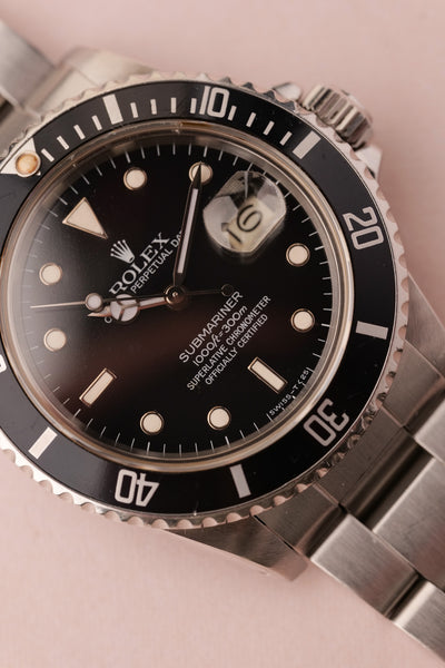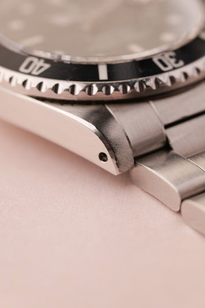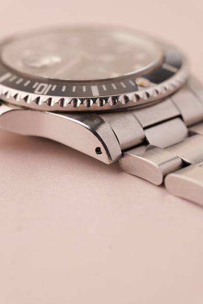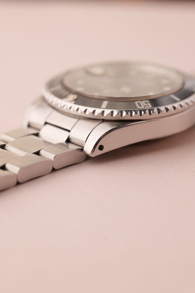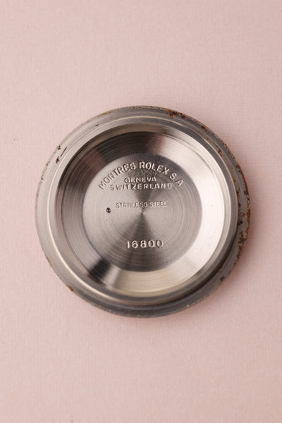 Description: This 16800 is a the perfect daily neo-vintage submariner. The 16800 follows after the plexiglass 1680 and was offered in both a matte dial finish (transitional) and a glossy (white gold surround) dial variant that introduced white gold rings to surround the luminous plots. This gloss dial variant uses tritium and has aged into a beautiful deep orangish yellow that is complimented by sharp black insert. The case appears unpolished and the bevels are sharp and thick throughout the watch. After a few years of wear this will patina quite nicely. These 16800 although still affordable in the world of vintage Rolex, are beginning to climb along with anything else that is in this type of collector’s condition.