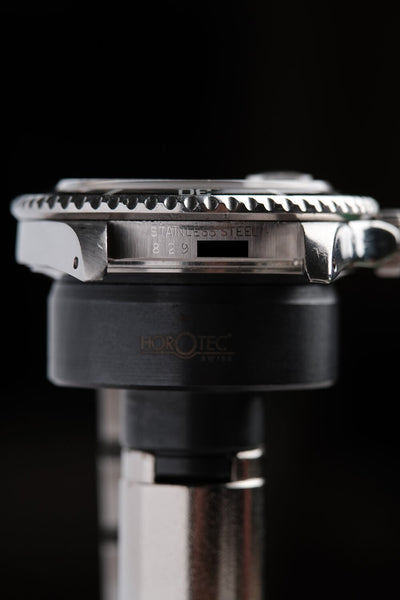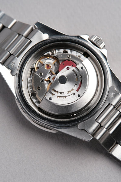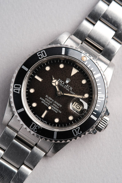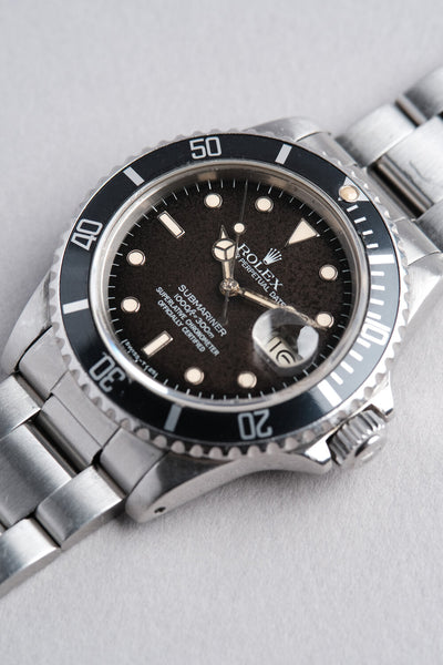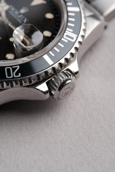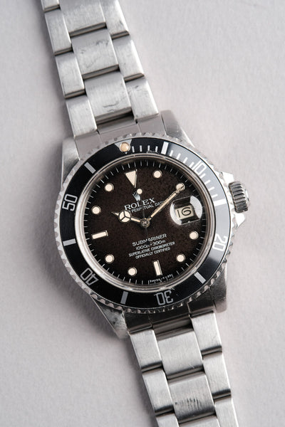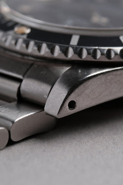 Description: 1984 Rolex Submariner with White Gold Surround Dial. Creamy patina throughout hands and dial. Dial maintains its glossy appearance while turning tropical brown. The patina is uniform throughout. Case and lugs appear sharp and even. Box, papers and tags are included.