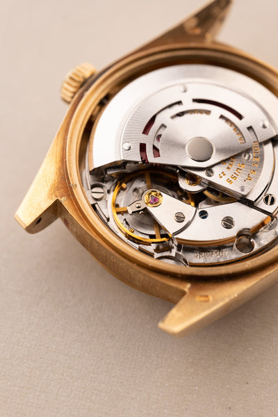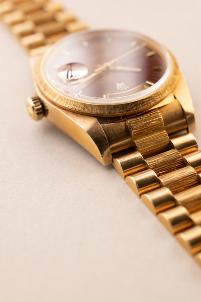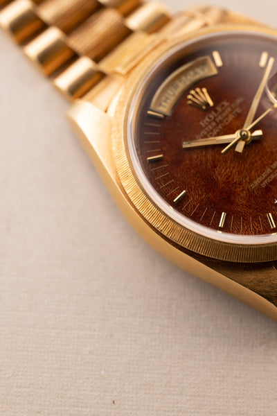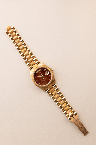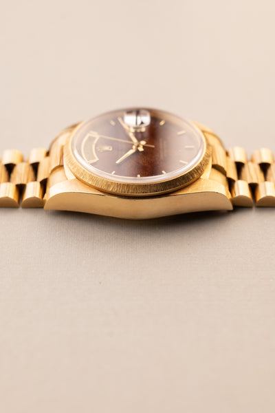 Description: Another beautiful example of a exotic wood dial. These watches are truly something special to see. This one in particular has a wood bark finish on the president bracelet which is something you don’t see often. Case is in great condition and appears unpolished.