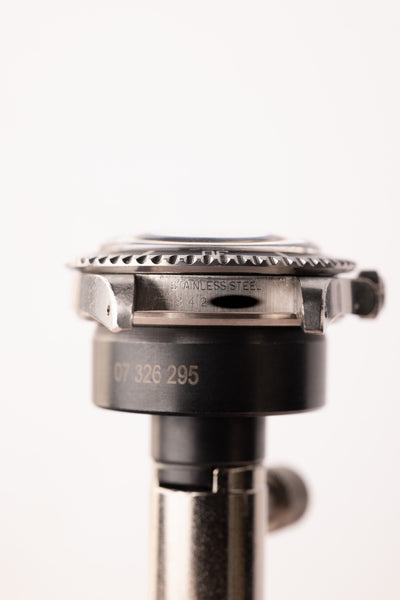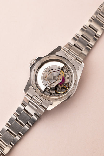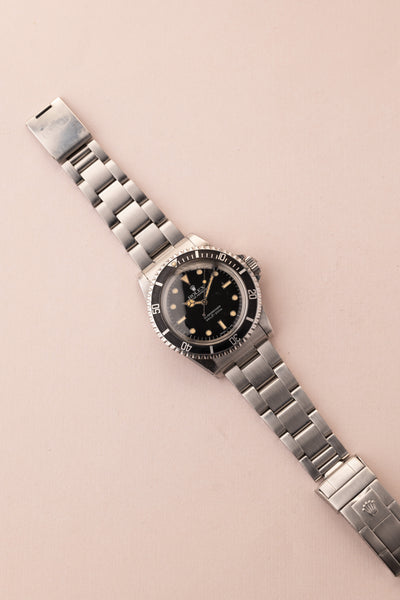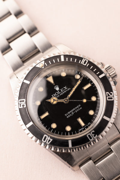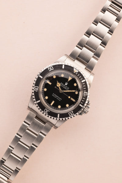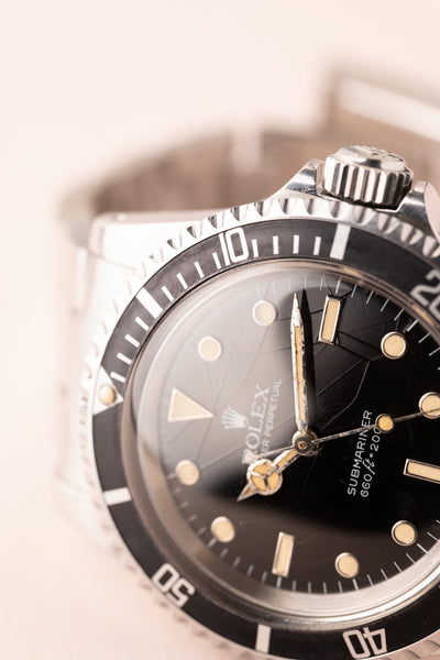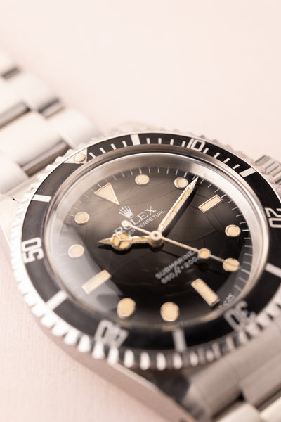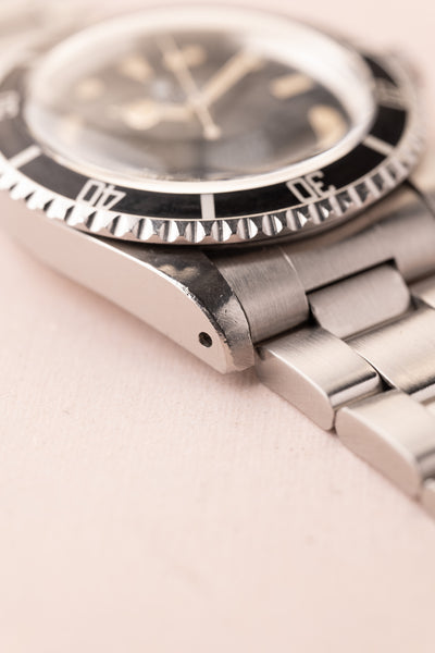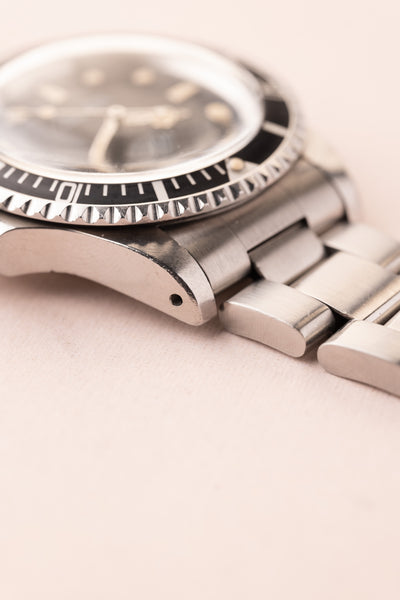 Description: 1984 Rolex 5513 Submariner , transitional wgs dial. This transitional 5513 houses the white gold surround glossy dial while in the vintage 5513 body with plastic dome crystal. This combination makes for some of the rarest Sub’s out there as they were only produced for a couple of years before the introduction of the 14060 body. What truly sets this 5513 apart is the spider dial that is associated with some of these 5513’s made in this era. The lacquer that sits on top of the dial cracks and appears like fine spider webs if seen from the right angle. We typically have not carried these types of dials as the appearance of this webbing is often uneven or unattractive. It certainly took a special one for us to host one on our page.