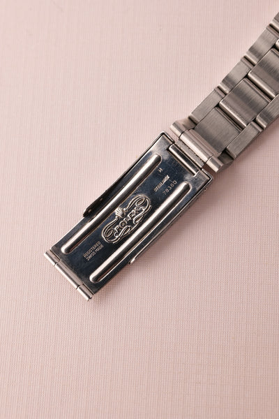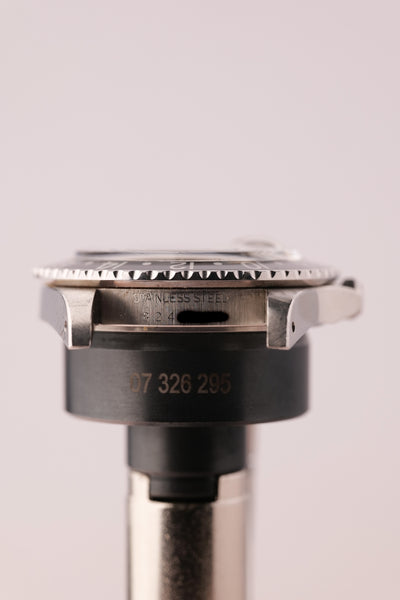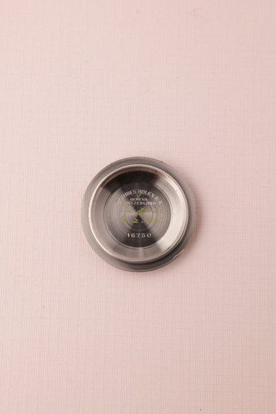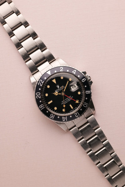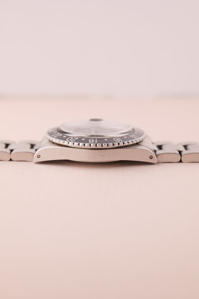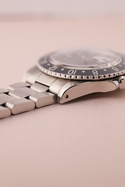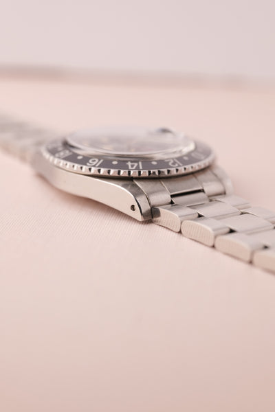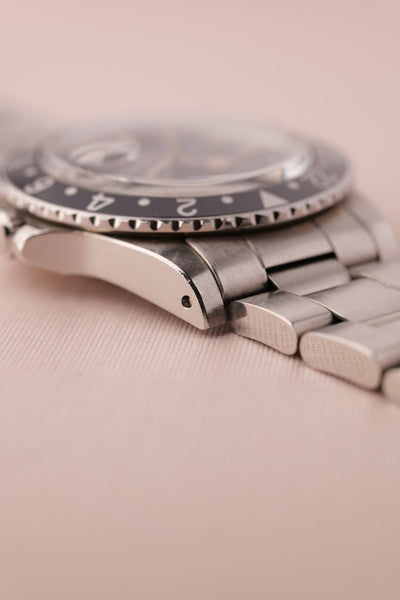 Description: When we get asked what Rolex are the best investments without having to give up an arm and a leg, we point them to neo-vintage pieces. The 16750 GMT sits on the early side of the neo-vintage scale coming shortly after the 1675 classic plexiglass variant. This 16750 has white gold surrounds were introduced to the pepsi gmt in this reference and with the tritium markers provide a warmth of color to the otherwise stark mirror dial. This piece has an excellent case that appears unpolished. The case remains thick and even in the lugs and crown guards.