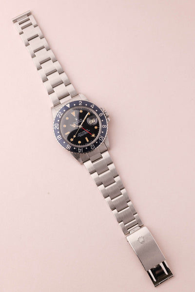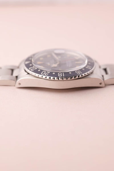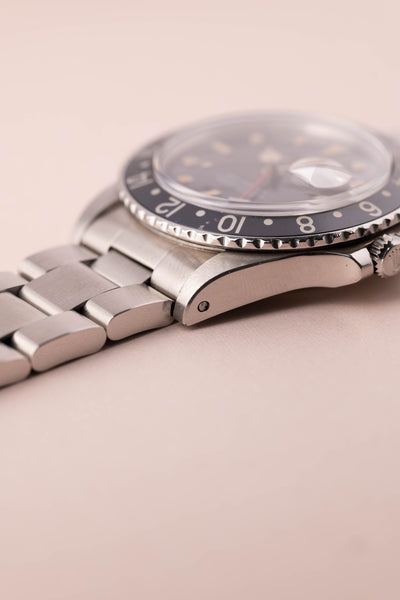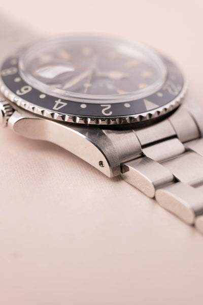 Description: When we get asked what Rolex are the best investments without having to give up an arm and a leg, we point them to neo-vintage pieces. The 16750 GMT sits on the early side of the neo-vintage scale coming shortly after the 1675 classic plexiglass variant. This 16750 has white gold surrounds were introduced to the pepsi gmt in this reference and with the tritium markers provide a warmth of color to the otherwise stark mirror dial. This piece has an excellent case that has been previously lightly polished in the past. The case remains thick and even in the lugs and crown guards.