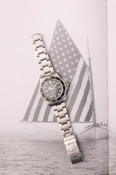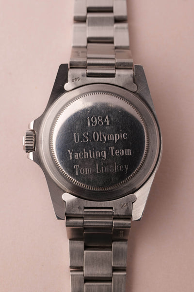 Description: We love it when a good watch has a story. This watch is no exception. A beautiful 5513 spider dial submariner that gets more interesting as you make your way to the case back. The back is inscribed “1984 US Olympic Yachting Team - Tom Linskey. To find out more about Tom’s career here just google his name. It’s no question that the previous owner will have a much cooler life than you will have but that’s still okay :)