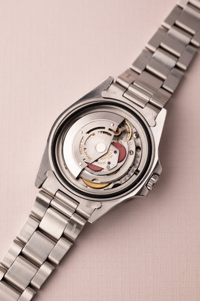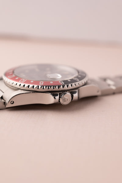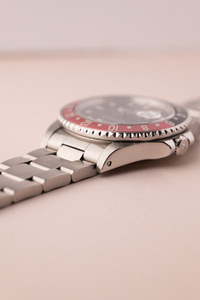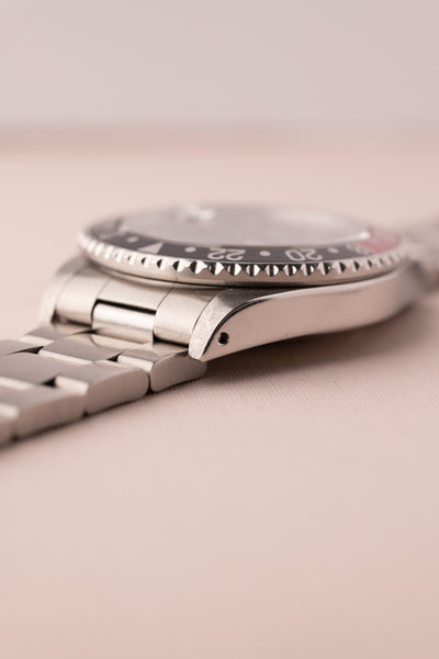 Description: 1985 16760 Fat Lady GMT. One of the rarest GMT references can be considered the 16760 otherwise known as the “Fat Lady.” The nickname was attributed to the increased case size around the lugs and crown guards as well as the overall thickness height of the case. Produced for only a few years and only in a coke bezel variant, these watches were overlooked in the past. Not only does the case size give the watch a completely different feel when compared to their thin counterparts, the coke bezel separates any confusion one may have mistaking it for a regular pepsi GMT. This watch in particular has an amazing creamy yellow dial and comes complete with box and papers