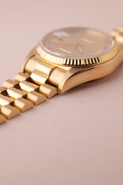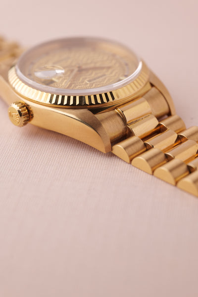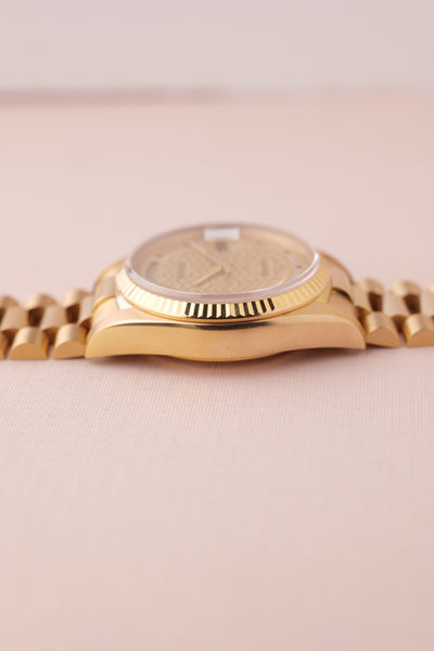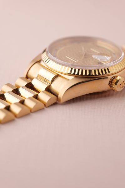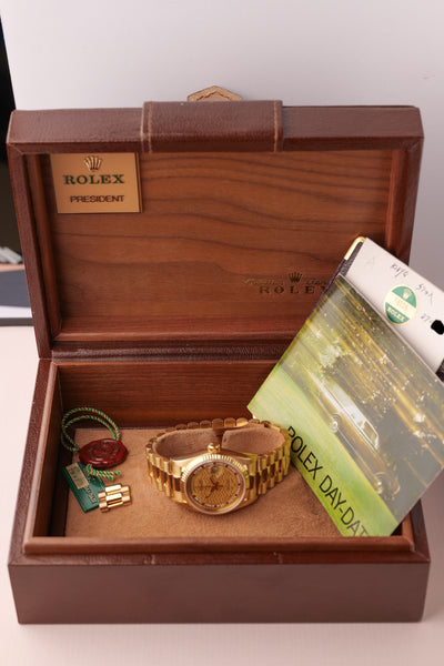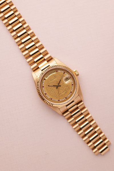 Description: This full set unpolished 18038 Day-Date is a factory beast. The dial shimmers at every single angle from the string diamond and ruby dial along with the engraved pave-like engravings.