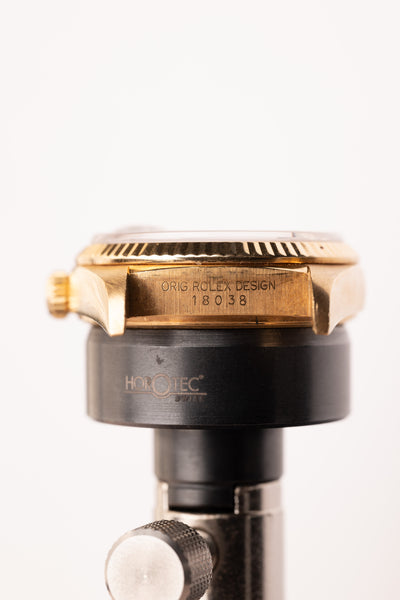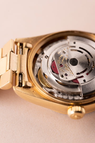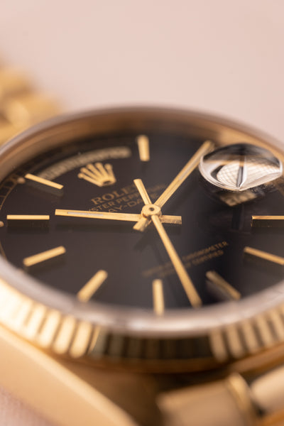 Description: This 1985 Day-Date reference 18038 with a dial we haven’t really seen much before. The Midnight black dial actually has tones of deep blue that has a slight gradient towards black. The case is in excellent condition, with the lugs thick and even all around. The lume plots are warm yellow and are all present.