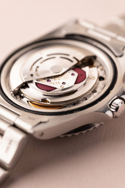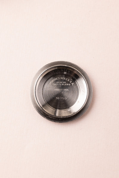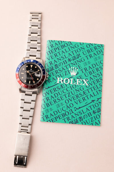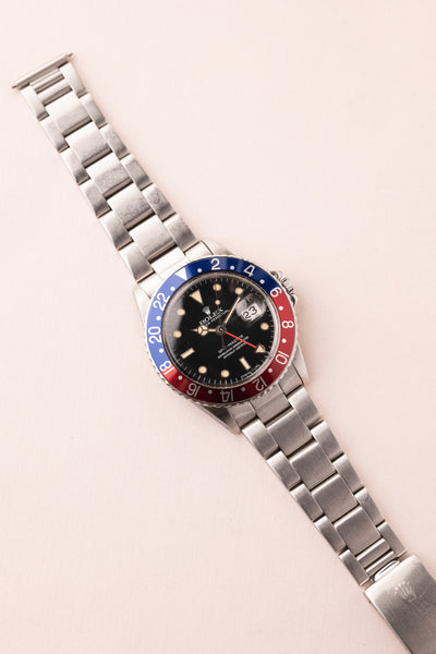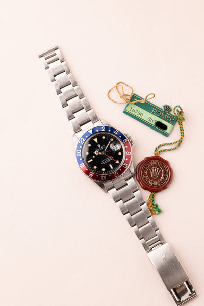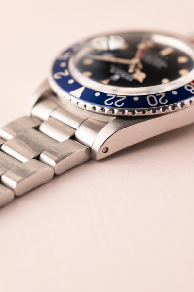 Description: 1986 Rolex 16750 GMT Pepsi. This 16750 is an excellent example of an early white gold surround Pepsi GMT. The lume on the dial has taken on an even deep yellow and is a nice contrast to the very glossy dial. A stand out feature is the very thick unpolished lugs and crown guards on the watch. When we think of the perfect 16750, this is at the top of the list