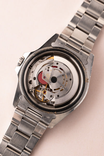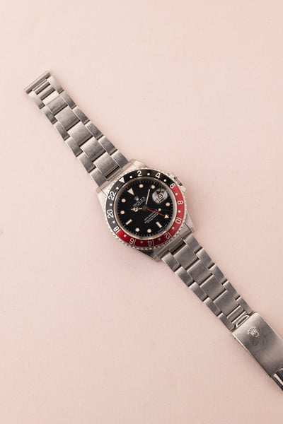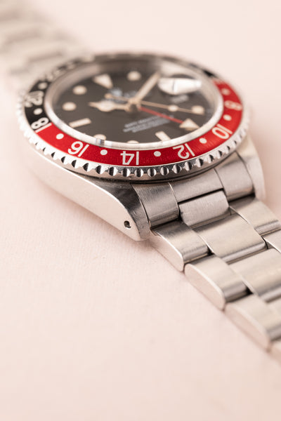 Description: The “Fat Lady” moniker is given to this 16760 reference which happens to be the first appearance of the coke bezel. The nickname was attributed to the increased case size around the lugs and crown guards as well as the overall thickness height of the case. Produced for only a few years and only in a coke bezel variant, these watches were overlooked in the past. Not only does the case size give the watch a completely different feel when compared to their thin counterparts, the coke bezel separates any confusion one may have mistaking it for a regular pepsi GMT.
