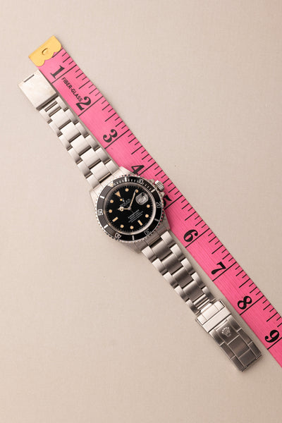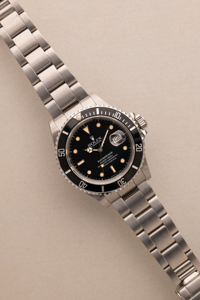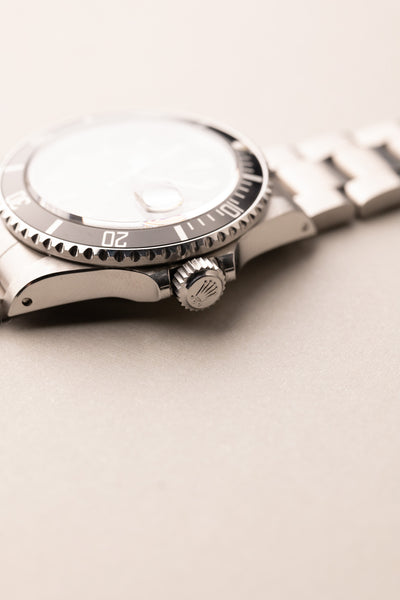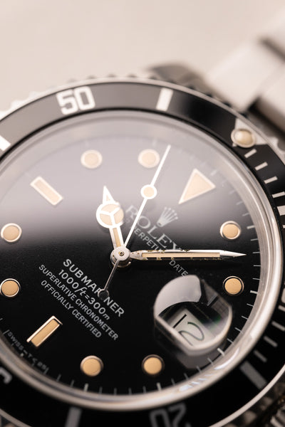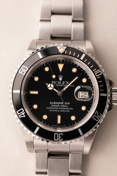 Description: This 16800 is a the perfect daily neo-vintage submariner. The 16800 follows after the plexiglass 1680 and was offered in both a matte dial finish (transitional) and a glossy (white gold surround) dial variant that introduced white gold rings to surround the luminous plots. This gloss dial variant uses tritium and has aged into a beautiful orangish yellow that is complimented by sharp black insert. The words NOS (new old stock) get thrown around a lot recently but we truly feel this watch is near NOS condition. It has been worn maybe a dozen times or less and maintains sharp shiny bevels and a condition that is hard to beat. It is a 10/10 in all aspects.