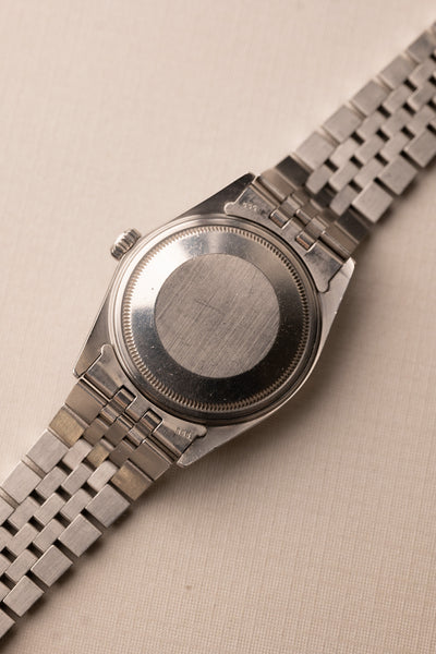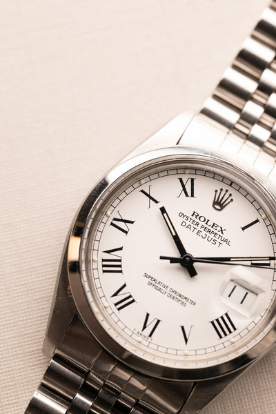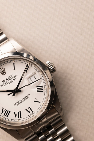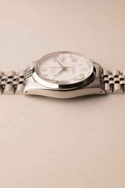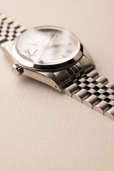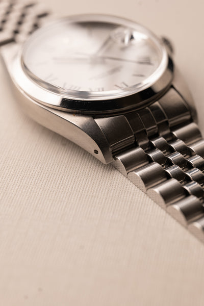 Description: A beautiful 1987 white Roman numeral dial date-just on a jubilee. The Roman numeral dials have been gaining quite a bit of popularity in the recent months, and we can see why. The case in great condition with thick lugs all around.