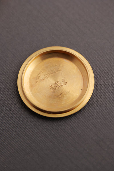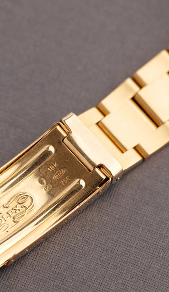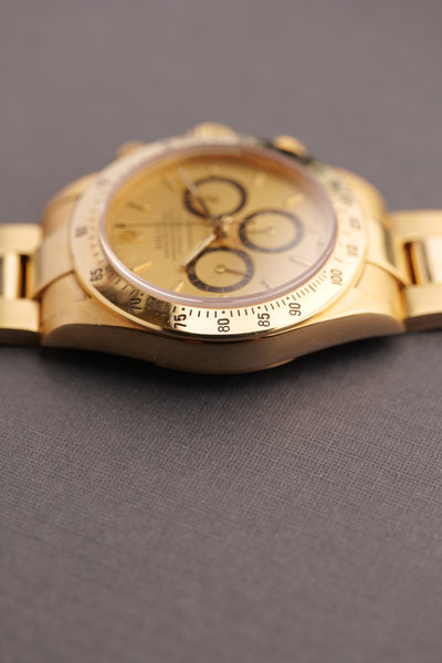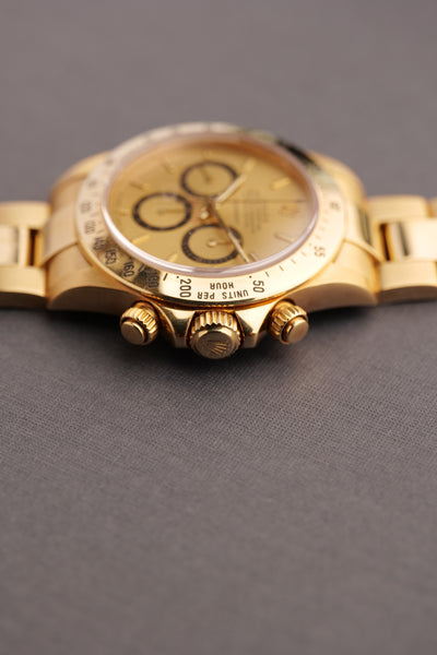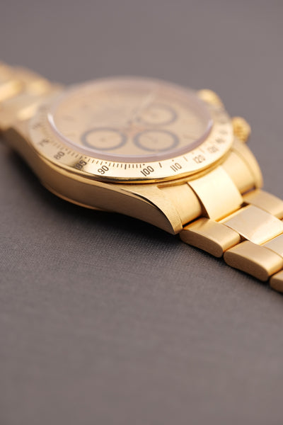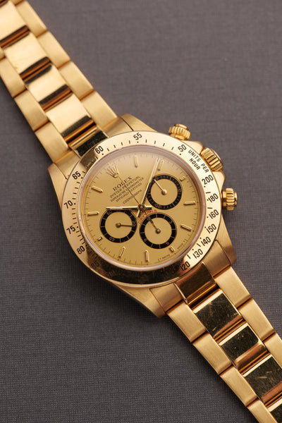 Description: 1987/88 Rolex Gold Daytona - Zenith 16528 with Champagne “Floating Cosmograph” Dial. This early variant of the Zenith Daytona’s came with the word “Cosmograph” appearing separately from the rest of the text and “floating” on the dial whereas the later dials brought this text back up to the rest of the lines of text. The serial is a super low R serial which leads us to believe it is a late 87 or possibly 88 watch. The case appears unpolished with sharp and thick lugs. This is a very rare watch given the condition and the MK1 floating cosmo dial.